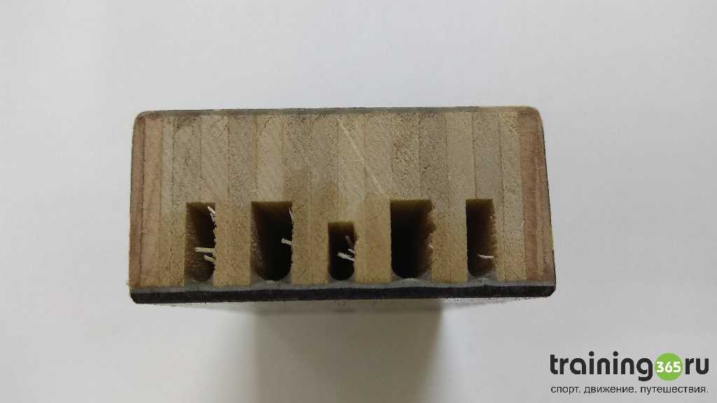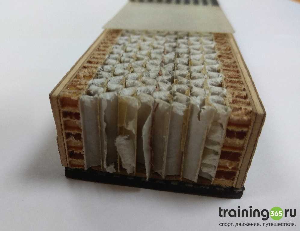 Топовые модели, как и у большинства производителей, состоят из сотового сердечника — это самый легкий наполнитель лыж. Соты условные, потому что форма у них совсем не сот. Сделаны из картона, пропитанного каким-то клеющим составом. Поверх сердечника укладывают несколько слоев ламината (количество зависит от нужной жесткости), сверху покрывают водоотталкивающей оболочкой с дизайном. Такое строение, как на фото, используется на Fischer RCS, Carbonlite и Speedmax.