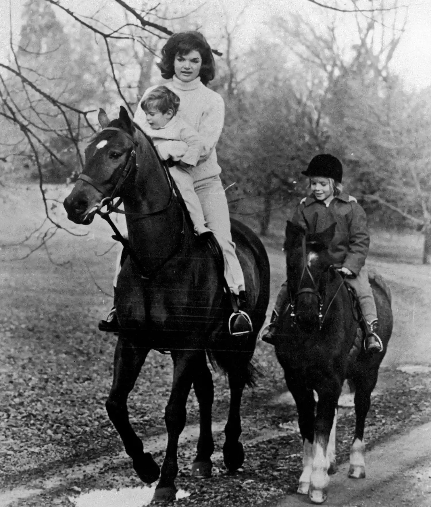Jackie Kennedy riding horses with Caroline and JFK Jr.