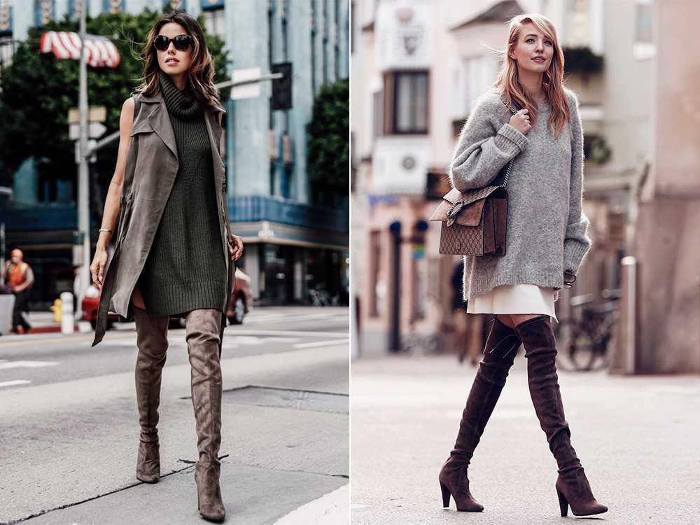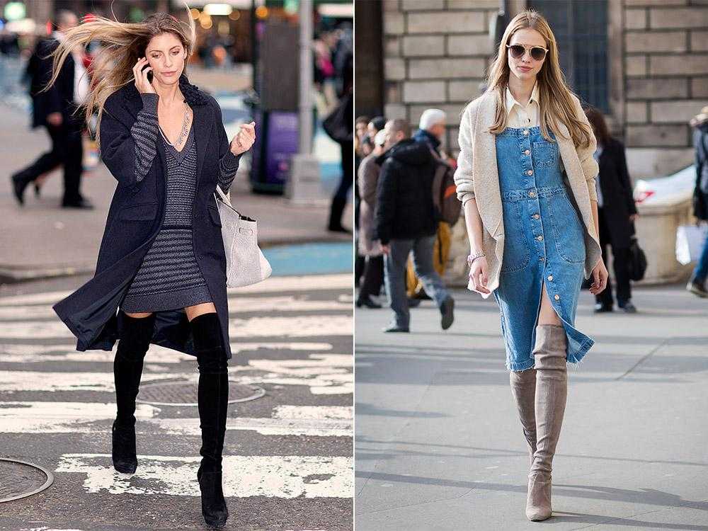 Платья. Как уже говорилось выше, мини платья лучше носить с замшевыми ботфортами на невысоком каблуке или плоском ходу. Высокие сапоги прекрасно сочетаются как с вязаными платьями, так и легкими «летящими».