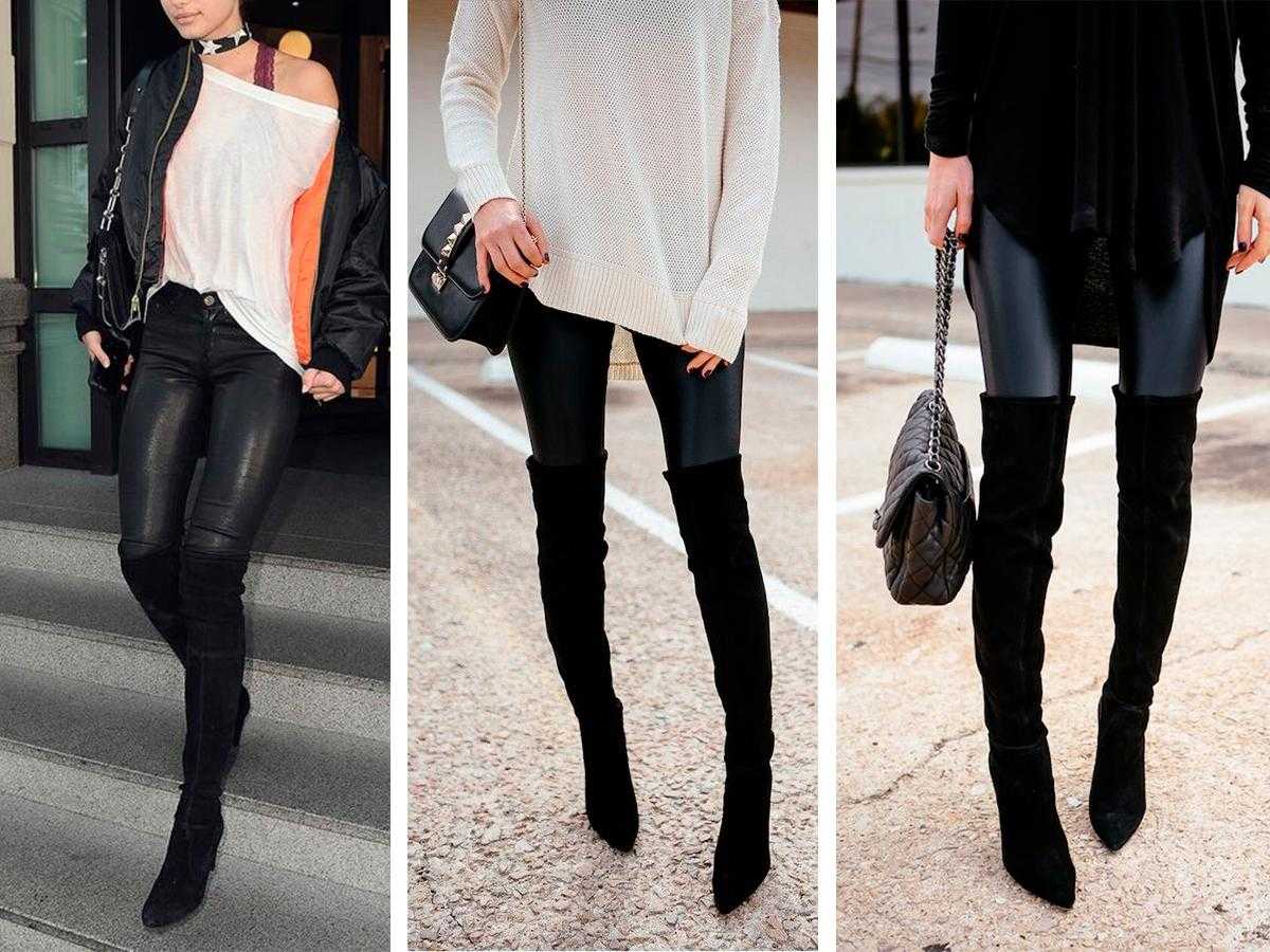 Джинсы скинни или леггинсы. Джинсы другого фасона под ботфорты лучше не надевать, это выглядит странно и несовременно, а вот скинни и леггинсы – самое то! Если леггинсы глянцевые или под кожу, то сапоги-чулки должны быть матовыми, замшевыми.