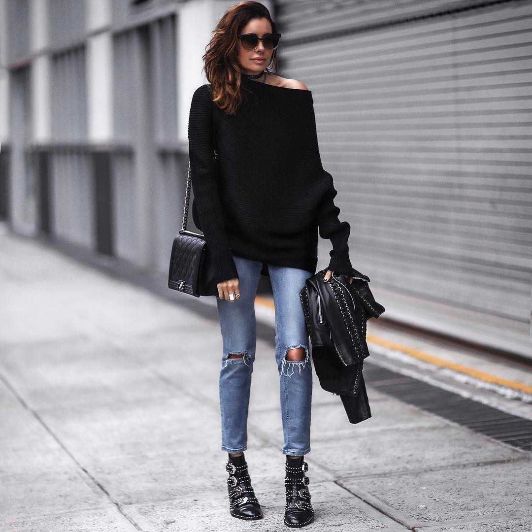 Черный total look с черными джинсами — актуальный образ, поэтому стоит взять его на вооружение. Такое подарит нам загадочный и элегантный образ. Хотя все-таки ходить так каждый день не стоит, или иногда добавляйте в такой наряд яркий акцент в виде сумочки или туфлей яркого оттенка.