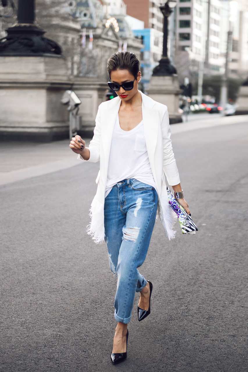 Ветхий деним не подходит для работы в офисе, где существует строгий дресс-код. Создавая повседневный образ, нужно тщательнее комбинировать детали. Смелый низ предполагает строгий выдержанный верх и простую обувь с минимальным каблуком.