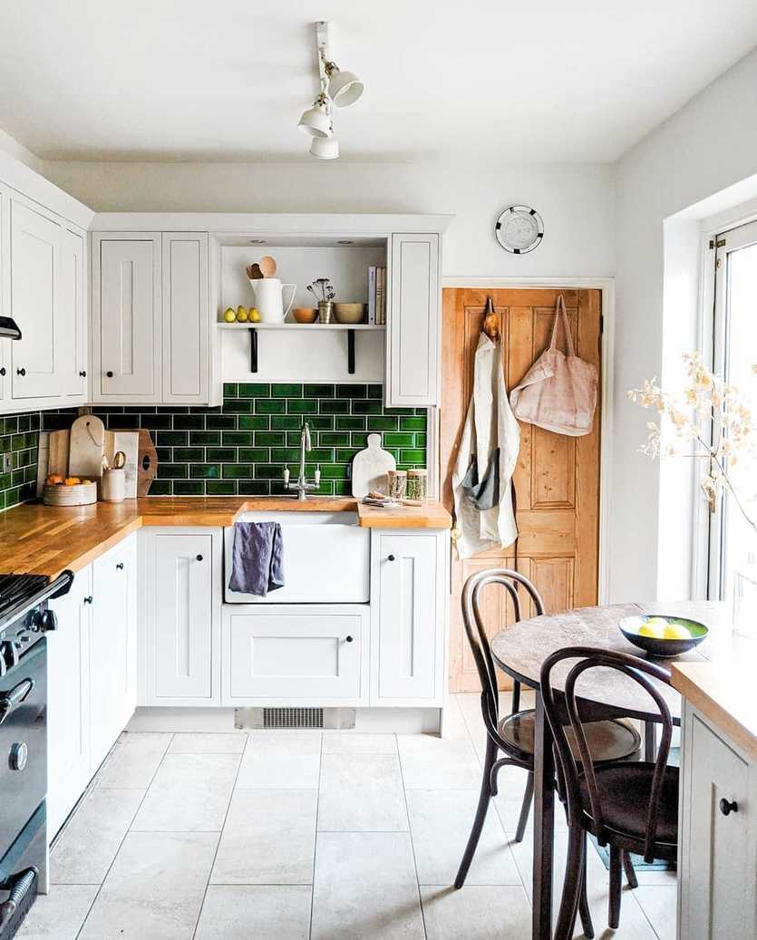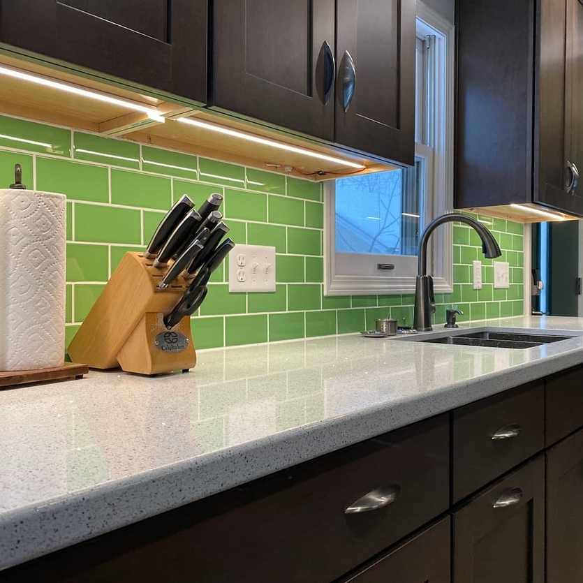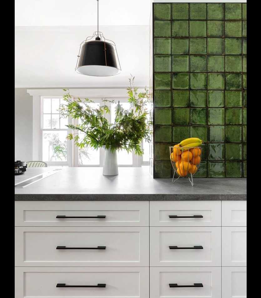 Один из самых выигрышных вариантов: лаймово-салатовый фартук смотрится ярко, акцентно, свежо — но не давяще и не кричаще. Минус: при жажде перемен заменить фартук будет не так-то просто (разве что использованы стеновые панели, а не плитка).