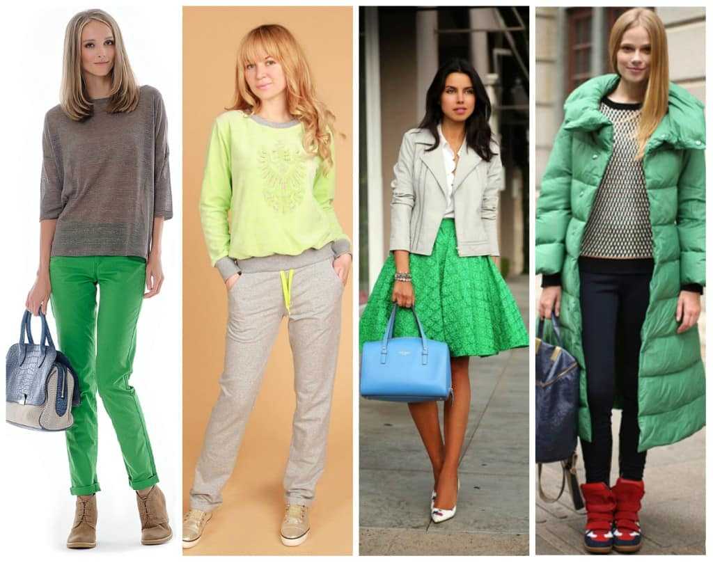 Особенно красиво сочетается салатовый с темно- и грязно-серым и с серым меланжем. Вот это вариант для повседневных дел, для прогулок и путешествий – стильно и ярко, но не чересчур кричаще.