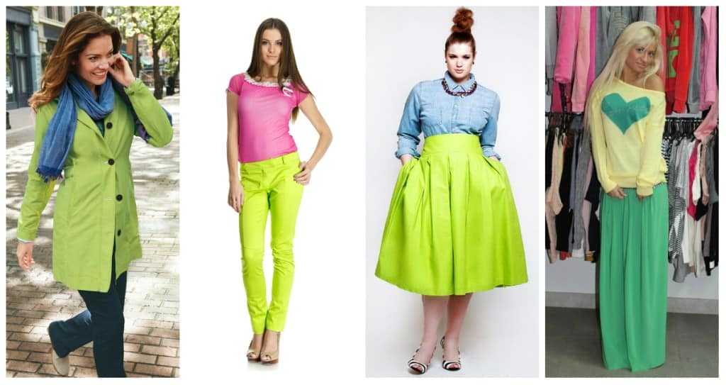 Не менее привлекательны и сочетания салатового с нежно-голубым и с сиреневым оттенками, эффект от них будет примерно такой же — связанный с определенными ассоциациями. С персиковым и бледно-розовым цветом ярко-салатовый может составить слишком яркое сочетание, но если вы не боитесь экспериментов (салатовая плиссированная юбка и бледно-розовая блузка), то этот вариант для вас.