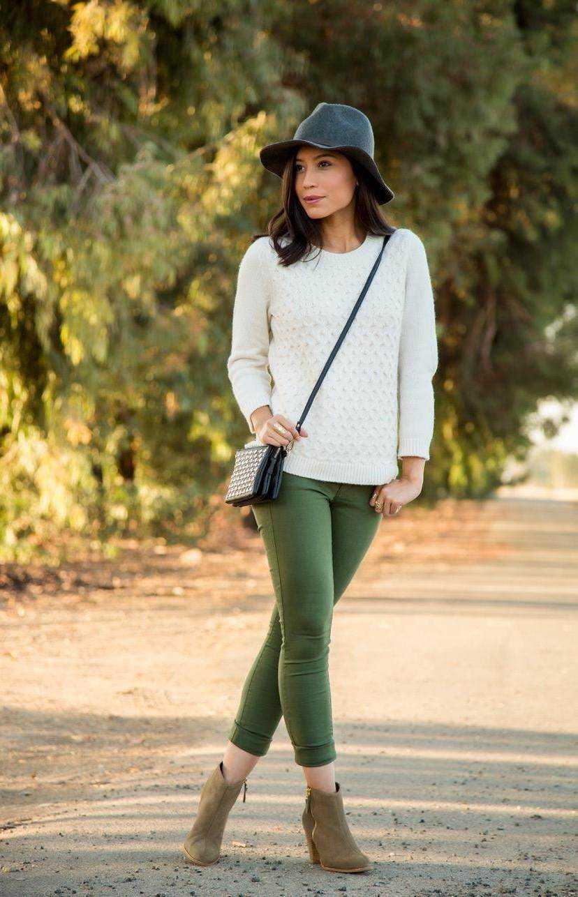 Зеленый цвет можно сочетать с белым, бежевым, серым, черным и коричневым. Также отлично подходят бирюзовый и изумрудный цвета. Чтобы образ был свежим, стоит добавить больше светлого, например, белую блузку или бежевый свитер. Загадочности образу придаст черная блузка или рубашка, темно-синий кардиган и черный высокие сапоги.