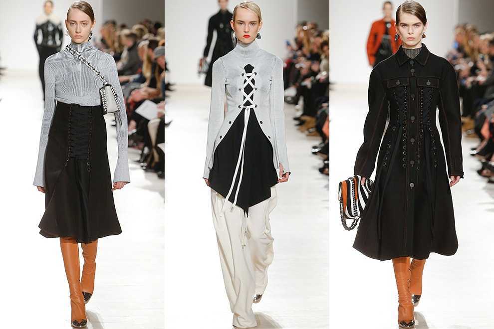 В коллекциях Proenza Schouler и Anthony Vaccarello корсетное плетение выступает в качестве декоративной детали – шнуровка здесь главный элемент, превращающий привычные платья, пиджаки, пальто и юбки в очень изысканные и соблазнительные.