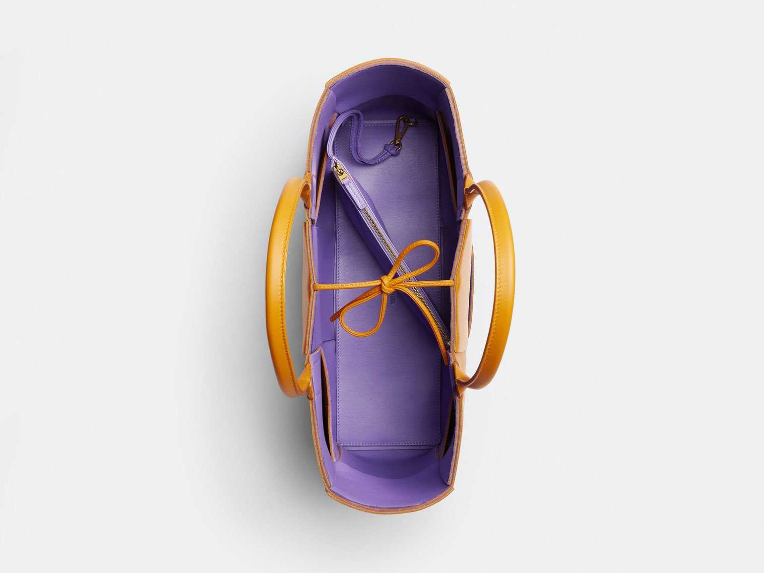 Сумка Bottega Veneta: фиолетовая внутри и оранжевая снаружи. Сочетание таких ярких и радостных цветов добавляет иронии классическому дорогому предмету из кожи.