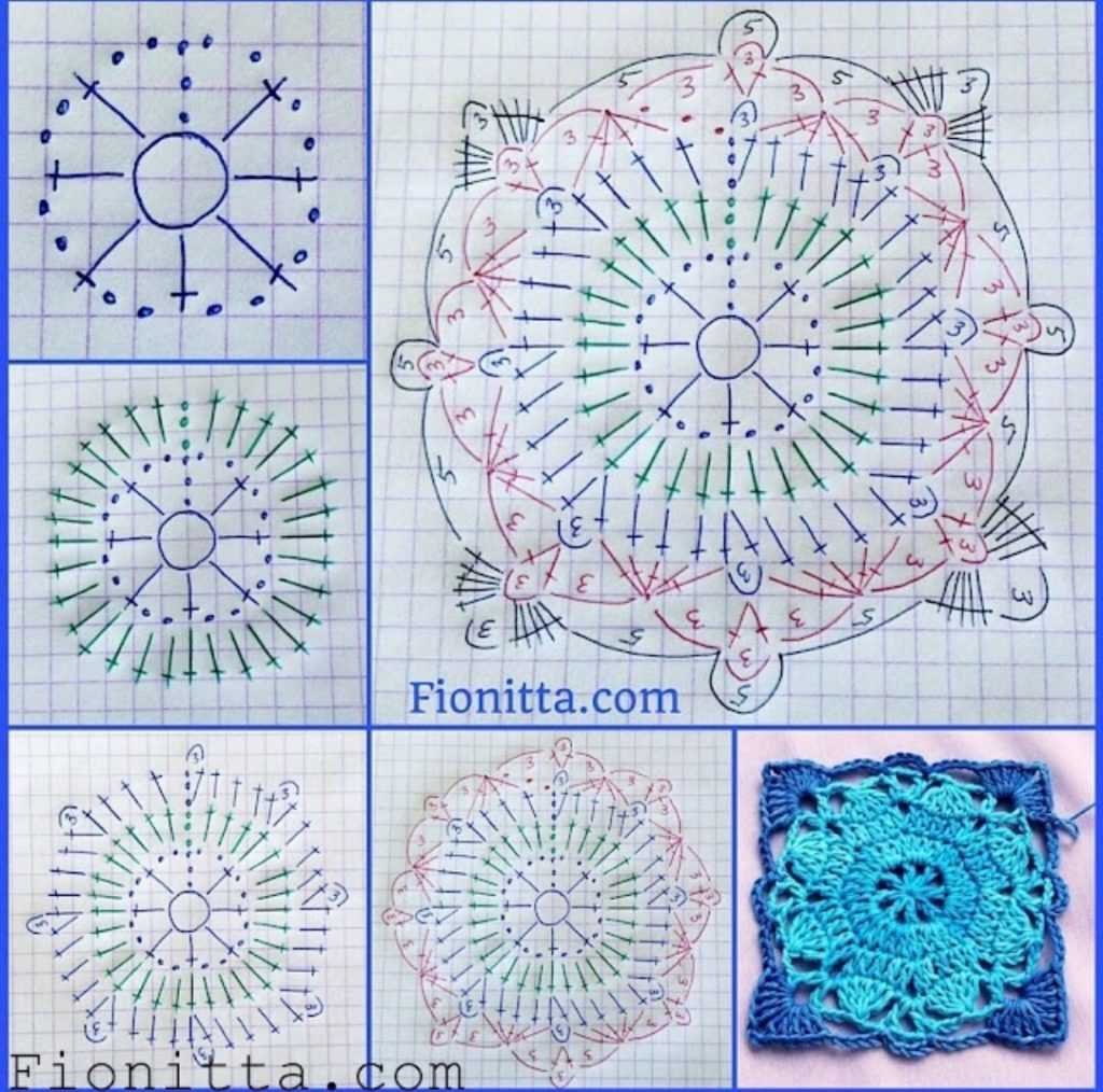 Обратите внимание: вязание начинается с кольца амигуруми (вязание дна авоськи), вывязывается ажурный круг донышка, а потом уже нужно перейти к бортам сумки (схема 1, пунктиром показан переход). Последняя схема цветка для украшения у основания ручки