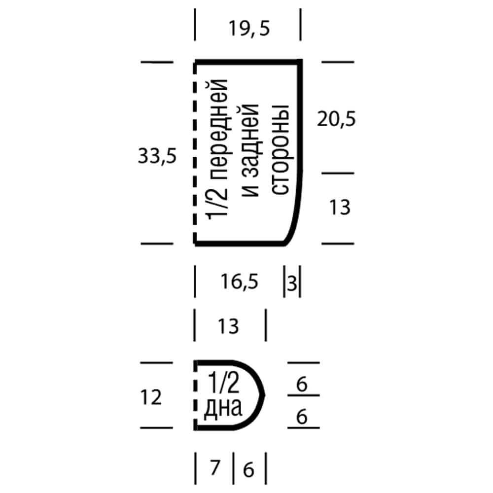 Вязание начинается из центра, состоит из двух одинаковых половинок, места соединения обозначены черными точками. Соединять две части сумки лучше всего в процессе вязания последнего ряда одной из половинок.