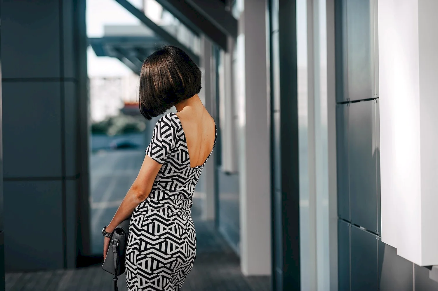 Прямые волосы похожи на струящуюся жидкость, плавно обтекающую фигуру женщины.