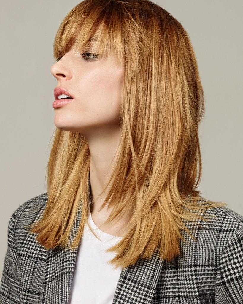 Треугольное, квадратное лицо хорошо обрамит прическа средней длины с челкой «на глаза».