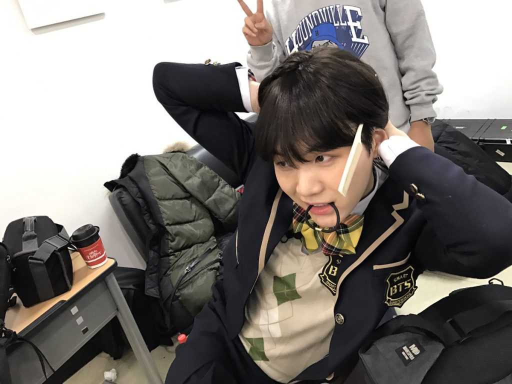 Если тщательно присмотреться к снимку, взглянуть на девушку в школьной форме, то можно заметить в ее выражении черты лица другого участника коллектива BTS по прозвищу Шуга. Это оказался розыгрыш со стороны нашего героя, Мин Юнги надевал школьную форму и превращался в приятную девушку. Причиной такой смены образа стали съемки музыкального видео под названием Run.