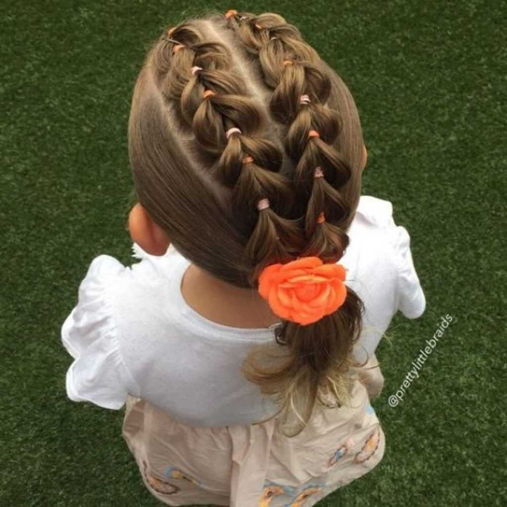Эта прическа отличается своей нарядностью, простотой и удобством. Она отлично подходит для девочек, которые ходят в детский сад или школу. Для этого необходимо поделить пряди при помощи горизонтального пробора на две части.