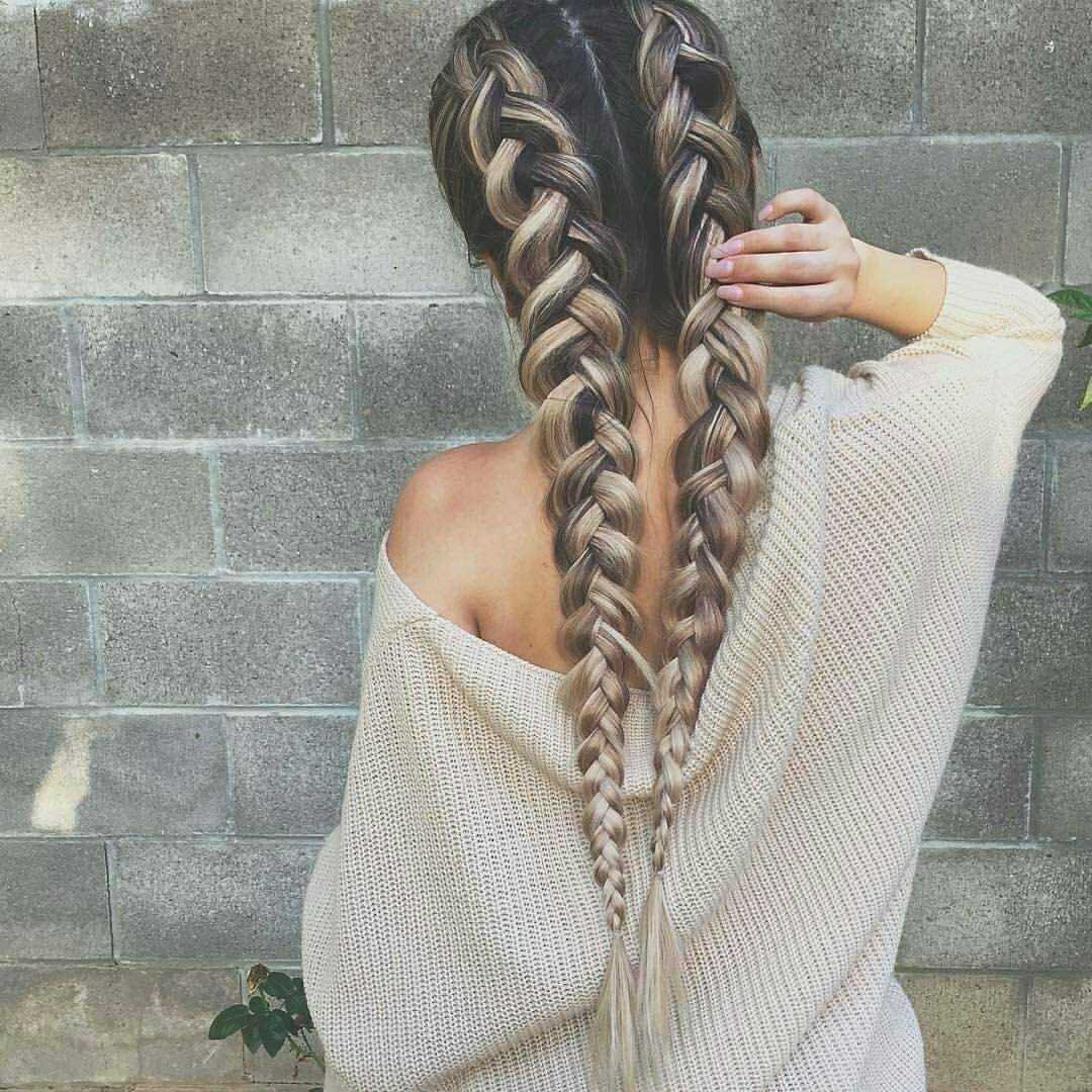 - Из каждой части волос следует заплести классическую косичку, закрепив ее кончик резинкой;