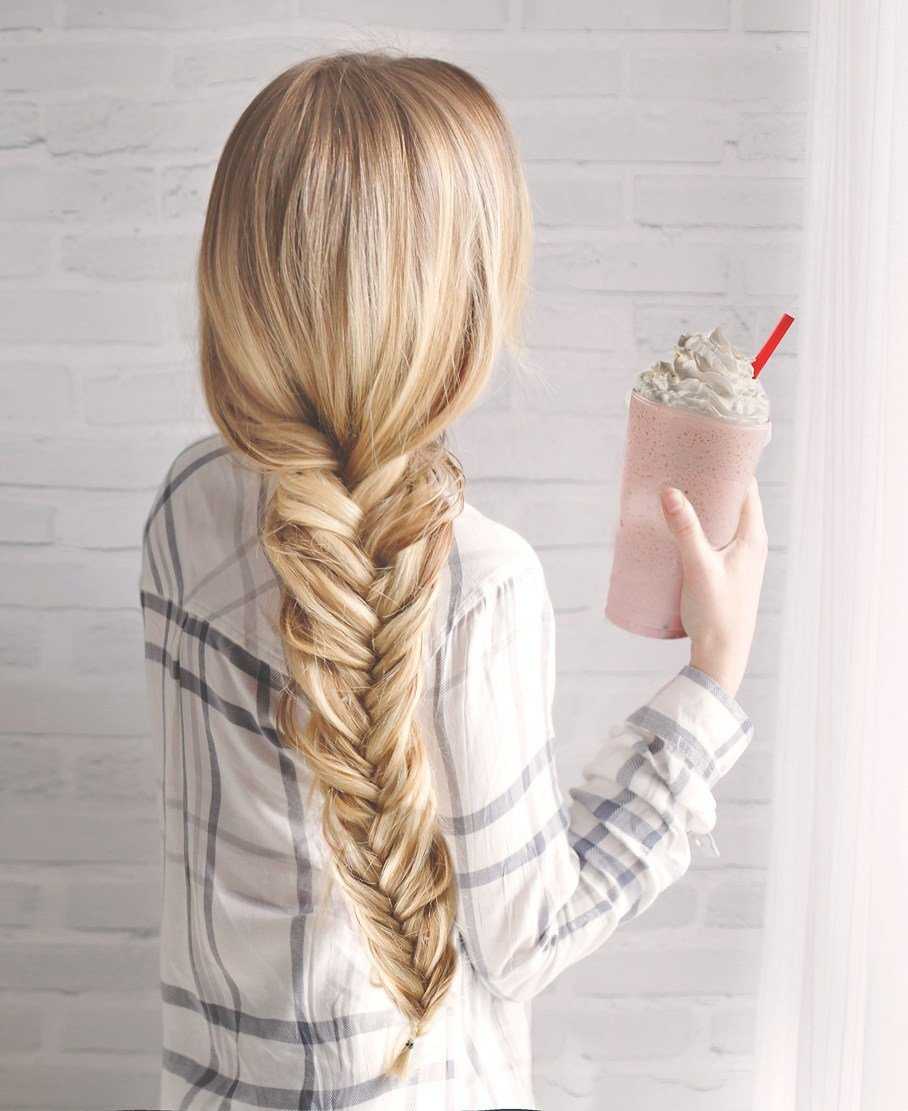 Если хочется простую, но стильную причёску, то стоит обязательно обратить внимание на «рыбий хвост». Первоначально необходимо сделать низкий хвост и поделить волосы на две равные части