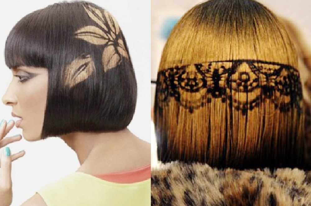 Один из самых смелых вариаций скрытого окрашивания. Определенная зона в задней части головы подстригается покороче, далее машинкой выбривается рисунок, который окрашивается в нужный цвет. Выбритый узор спрятан под общую массу волос. Но как только локоны будут собраны в высокую причёску, эффектное окрашивание будет на виду.