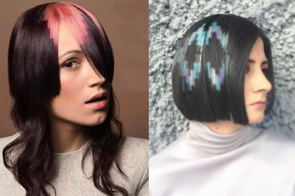 Пиксельный рисунок эффектно смотрится на прямых гладких волосах. Суть этой техники заключается в создании на прядях узоров из цветных квадратиков. Некоторые девушки закрашивают пикселями обозримую часть верхних локонов. А другие предпочитают удивлять окружающих необычными решениями и скрывают окрашивание под основными прядями.