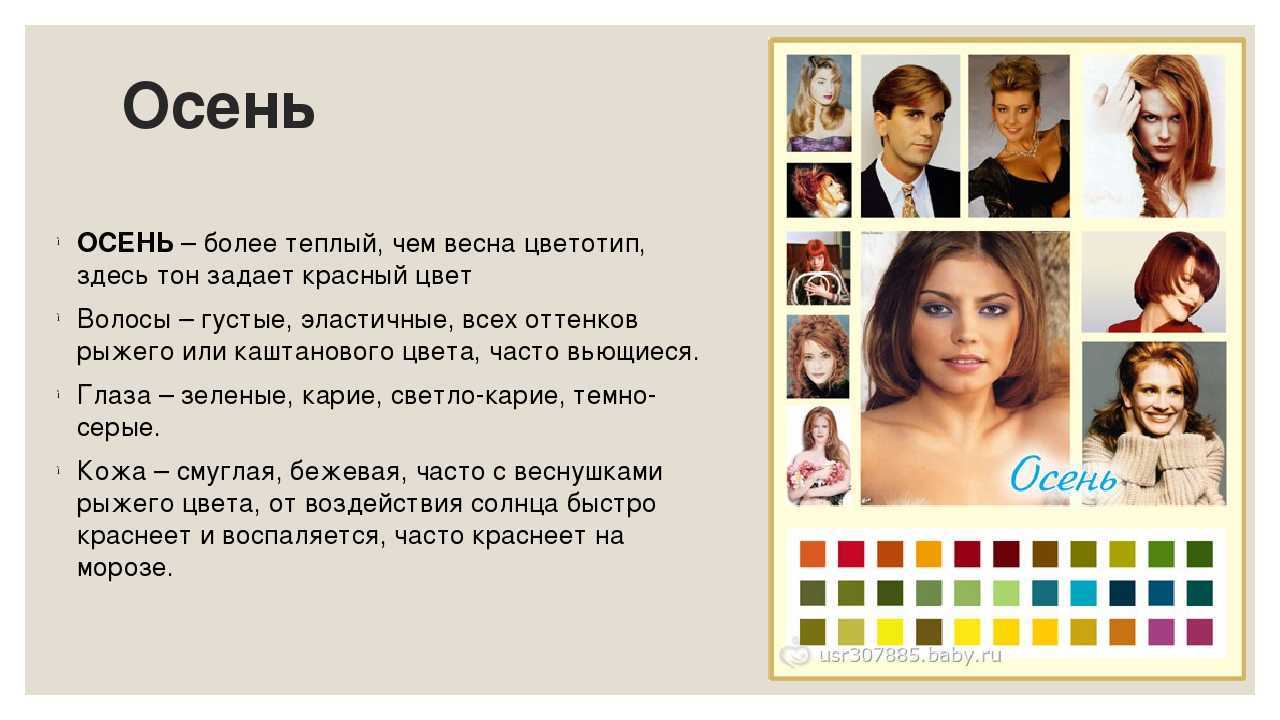 Ещё одним тёплым цветотипом считается «осенний». Этот сезон характеризуется исключительно красными оттенками. Глазу у таких девушек в основном бывают ярко-зелёного, насыщенного янтарного либо коньячного цвета. Локоны густые, упругие и включают всю палитру рыжих тонов. Всё лицо обычно у таких дам усыпано веснушками и обладает кожей бежевого цвета, которая весьма чувствительна к солнечным лучам. «Осенним» женщинам больше всего идут наряды кирпичного либо горчичного оттенка.