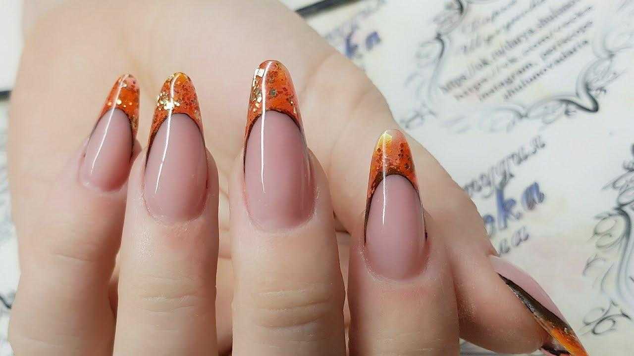 Идеальный материал в создании янтарного френча. Маникюрная фольга свободно продается в магазинах, стоит недорого. Вместе с ней можно в декоре часто используется акриловая пудра, оформляет ею поверхность только что наращенную пластину ногтя вместе с базовым покрытием.