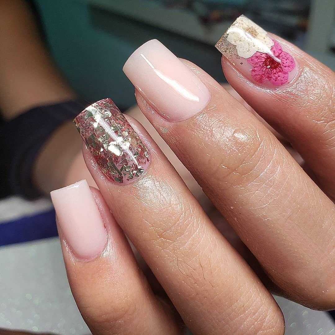 - Весной популярны нежные варианты маникюра с сухоцветами и бабочками.