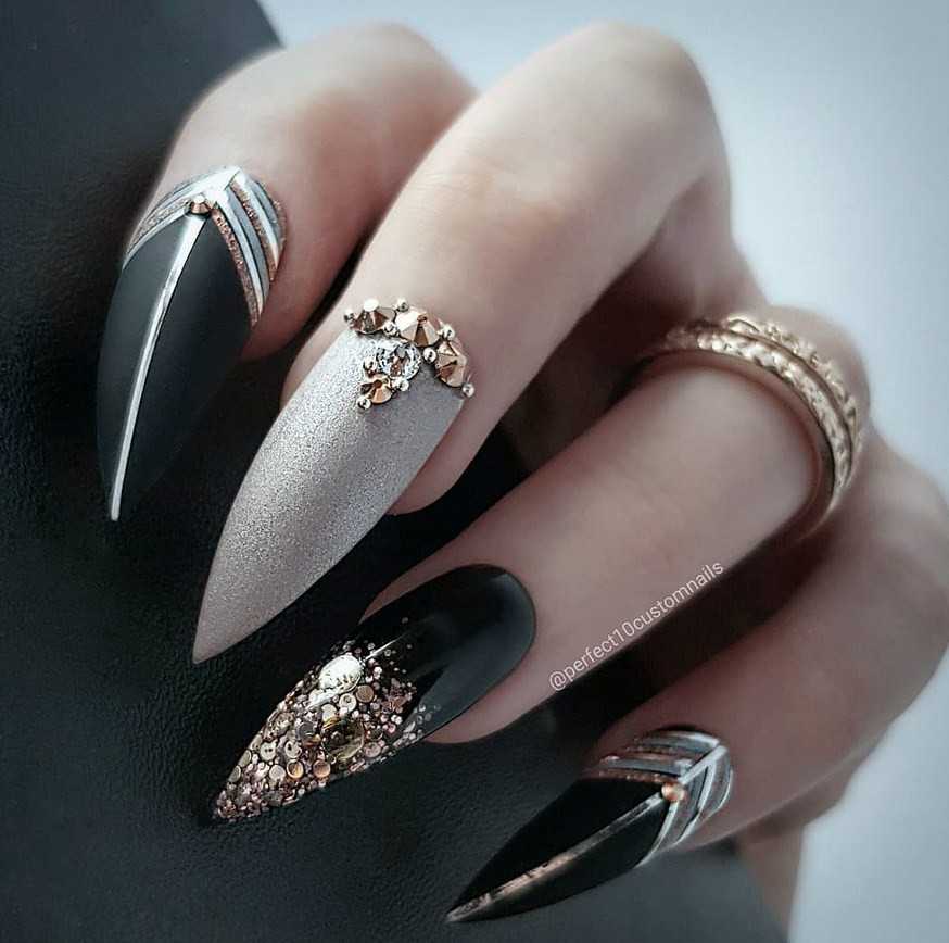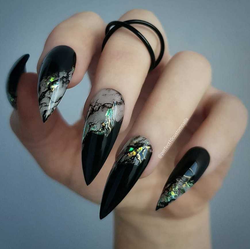 Помните, что ногти с острой формой и таким дизайном могут подойти на любой праздник. Чтобы добиться различных переливов, зеркального эффекта или бесподобного жемчужного блеска, достаточно использовать втирку: