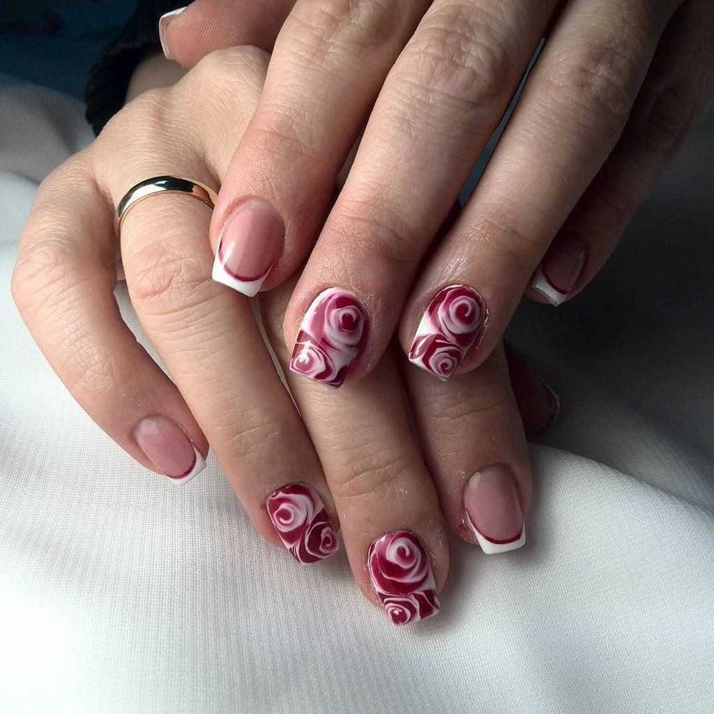 Французский маникюр — прекрасная основа для различного декора. Его можно выполнить с блестками, украсить стразами или дополнить рисунками. Отлично смотрится френч с выделением безымянного пальца нюдовым оттенком.