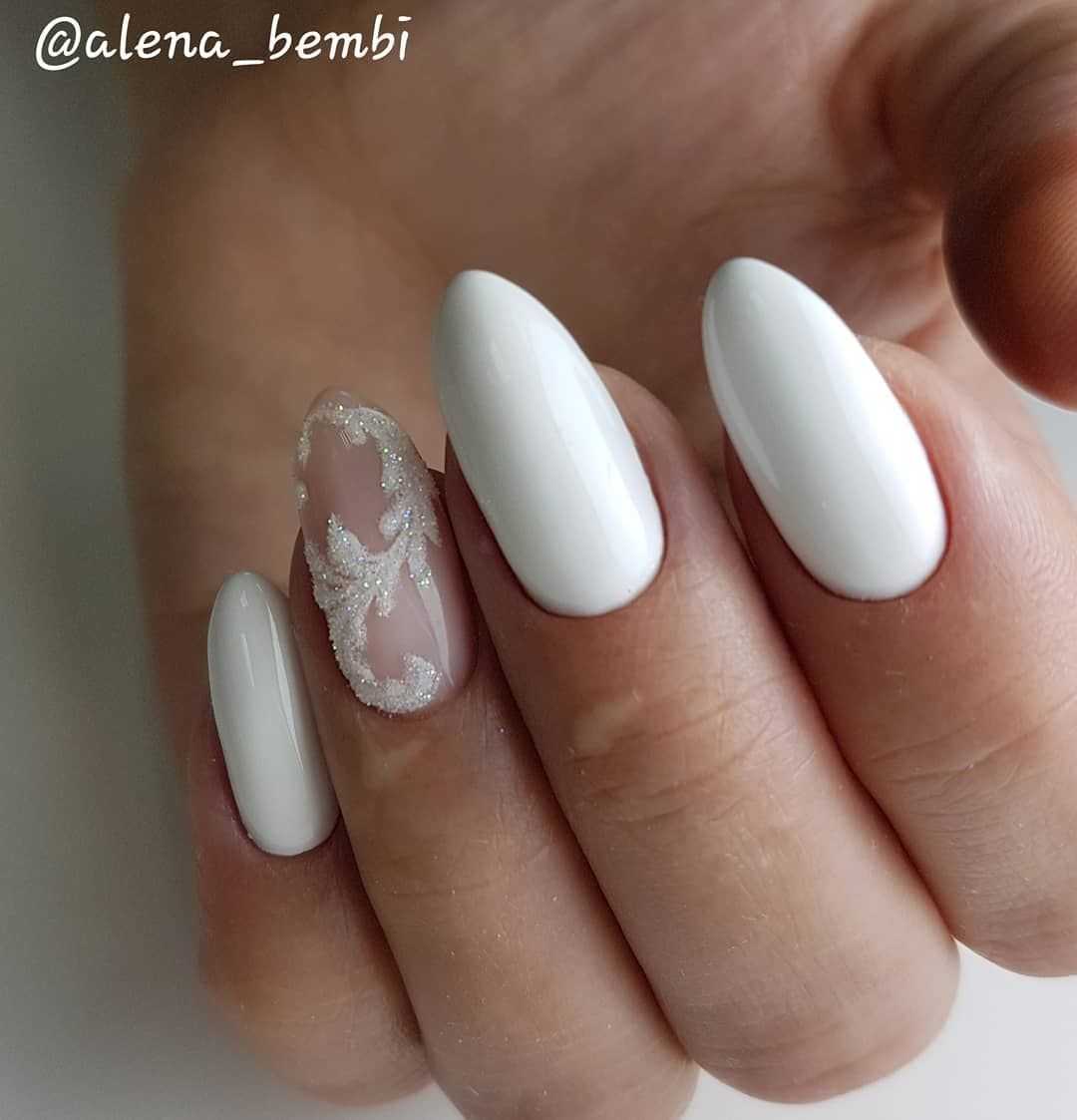 Однотонный маникюр практически не нуждается в декоре, особенно если речь идет о белом цвете. Но вы всегда можете дополнить маникюр стразами или бульонками в прикорневой зоне, серебряным глиттером.