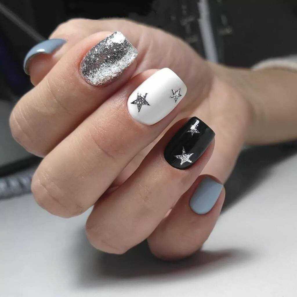 Еще один вариант получить красивый и сияющий маникюр — это обратиться к блесткам или глиттеру. Эти варианты декора неподражаемо работают в паре черно-белым покрытием, в особенности, если первые нанесены в небольшом количестве в качестве маленького акцента.