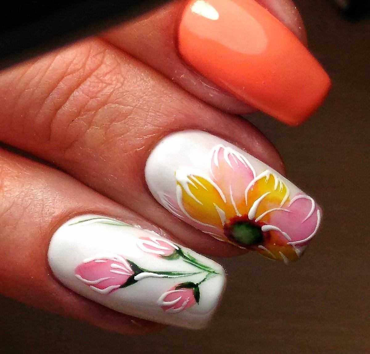 Белый маникюр 2019 года с росписью предполагает изображение на ногтях крупных рисунков, геометрических узоров и орнаментов. Это могут быть как цветы и фрукты, так и китайская или восточная роспись.