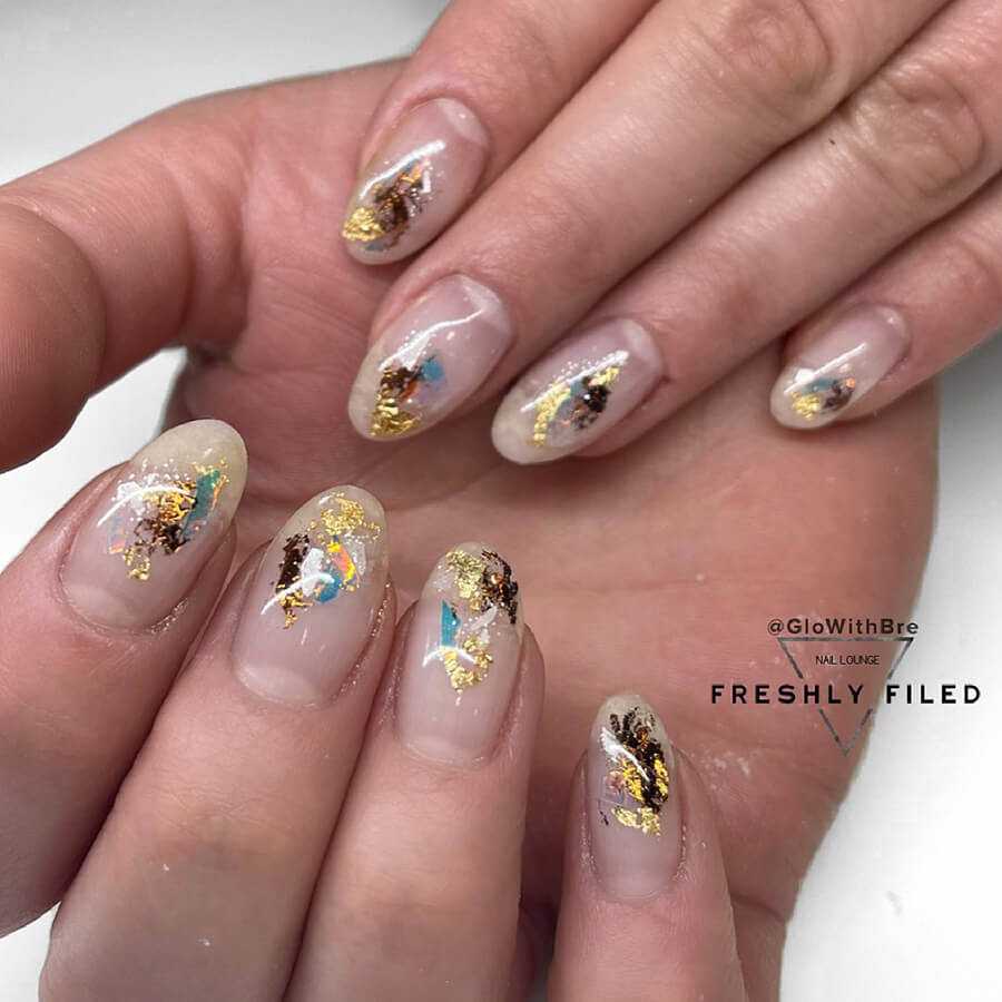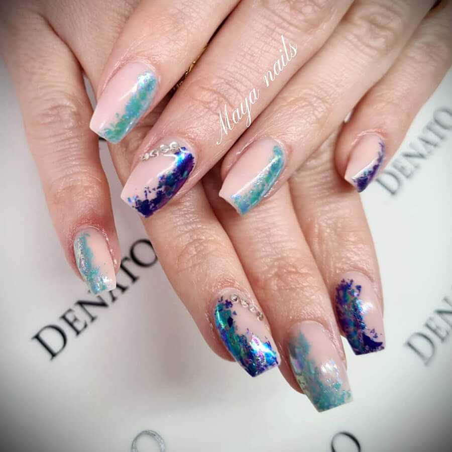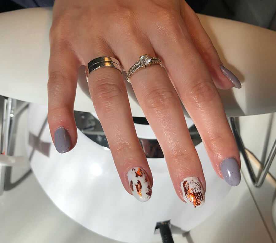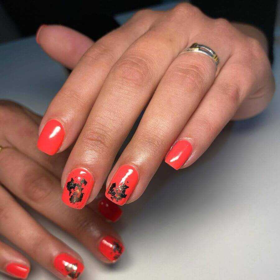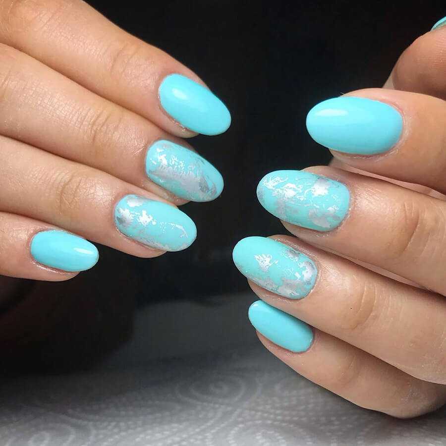В этом маникюре отсутствуют ограничения. Единственное требование состоит в том, чтобы цвет лака и фольгированной бумаги органично сочетались между собой.