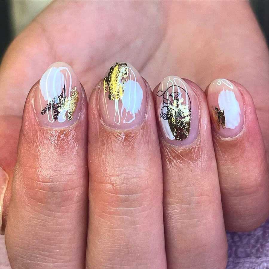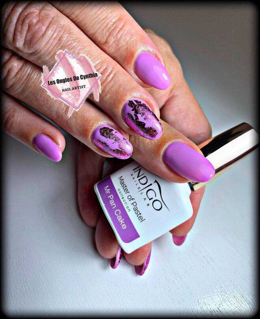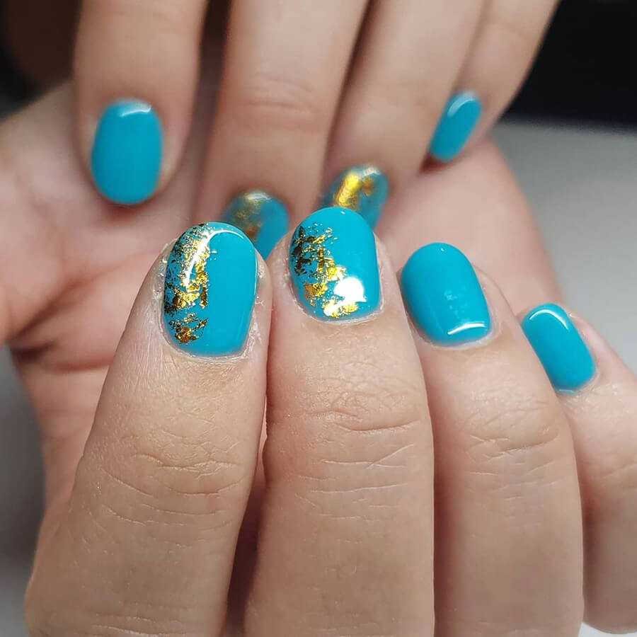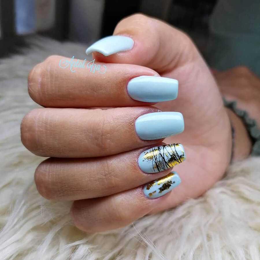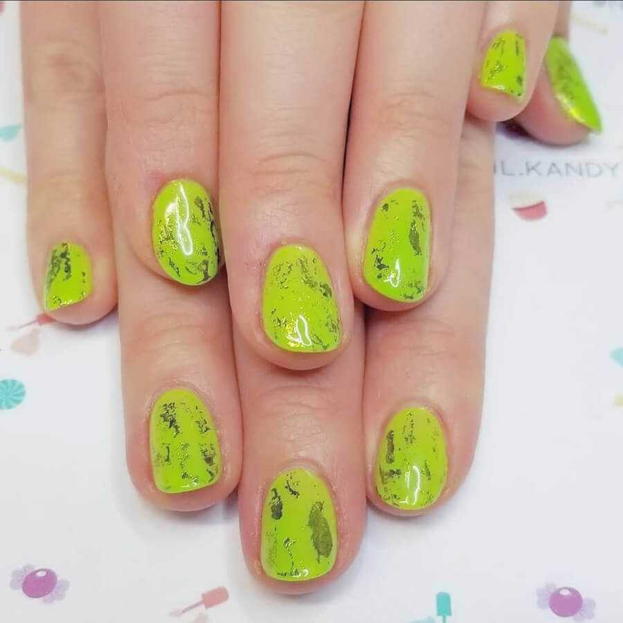 В этом маникюре отсутствуют ограничения. Единственное требование состоит в том, чтобы цвет лака и фольгированной бумаги органично сочетались между собой.