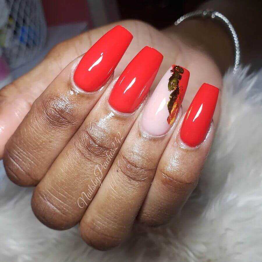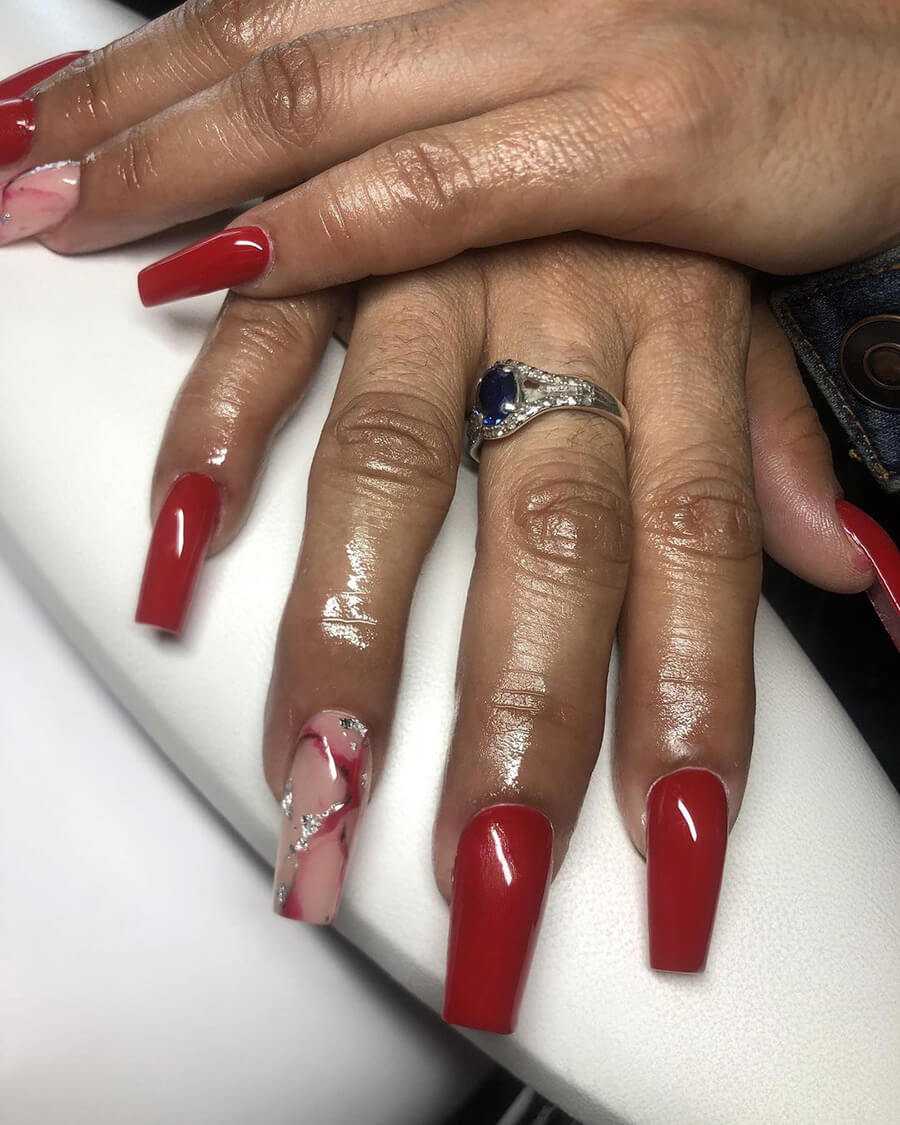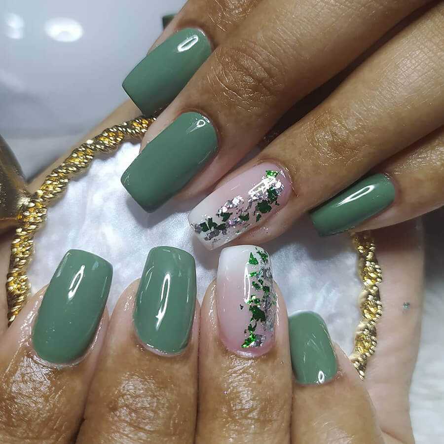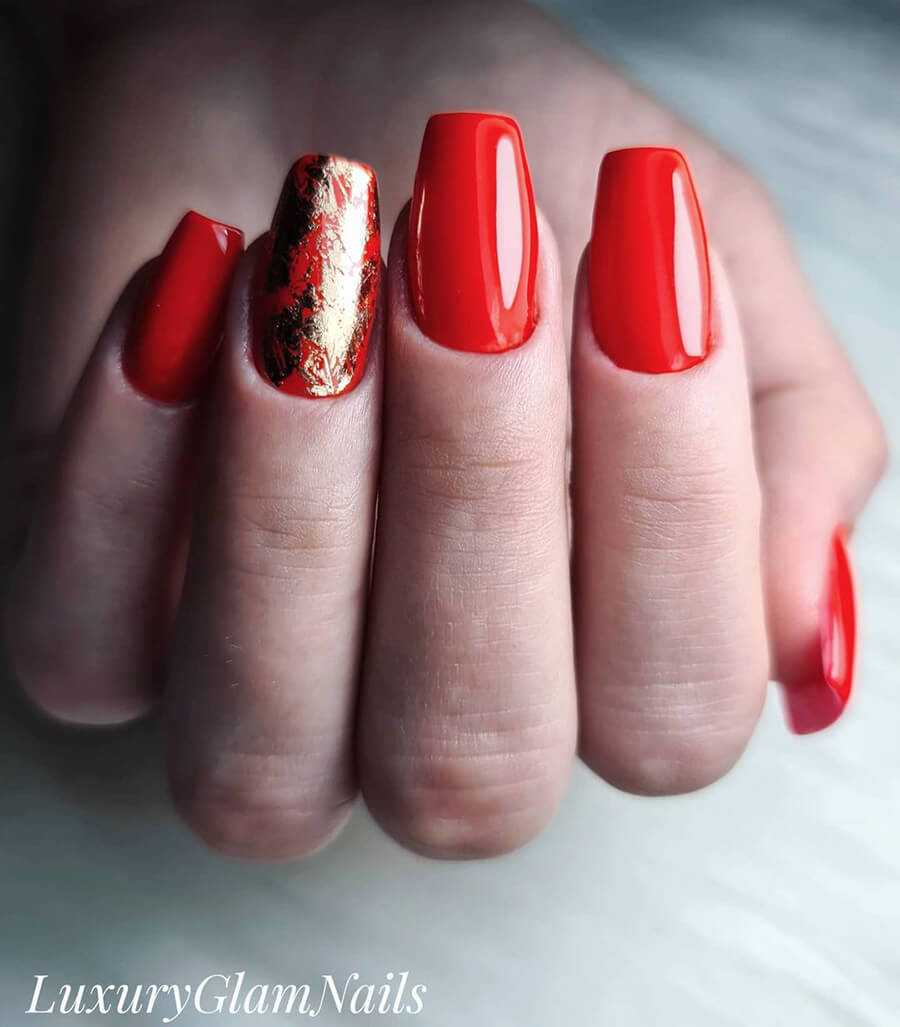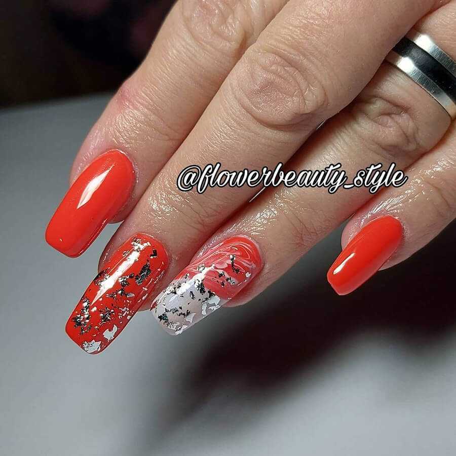 В этом маникюре отсутствуют ограничения. Единственное требование состоит в том, чтобы цвет лака и фольгированной бумаги органично сочетались между собой.
