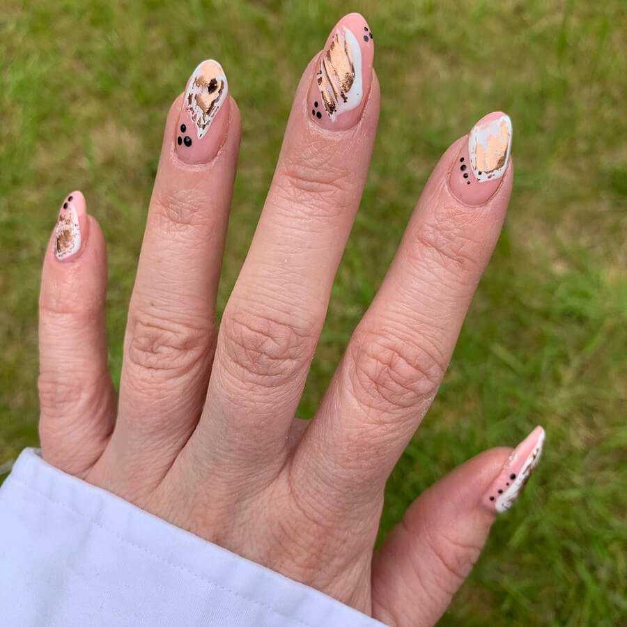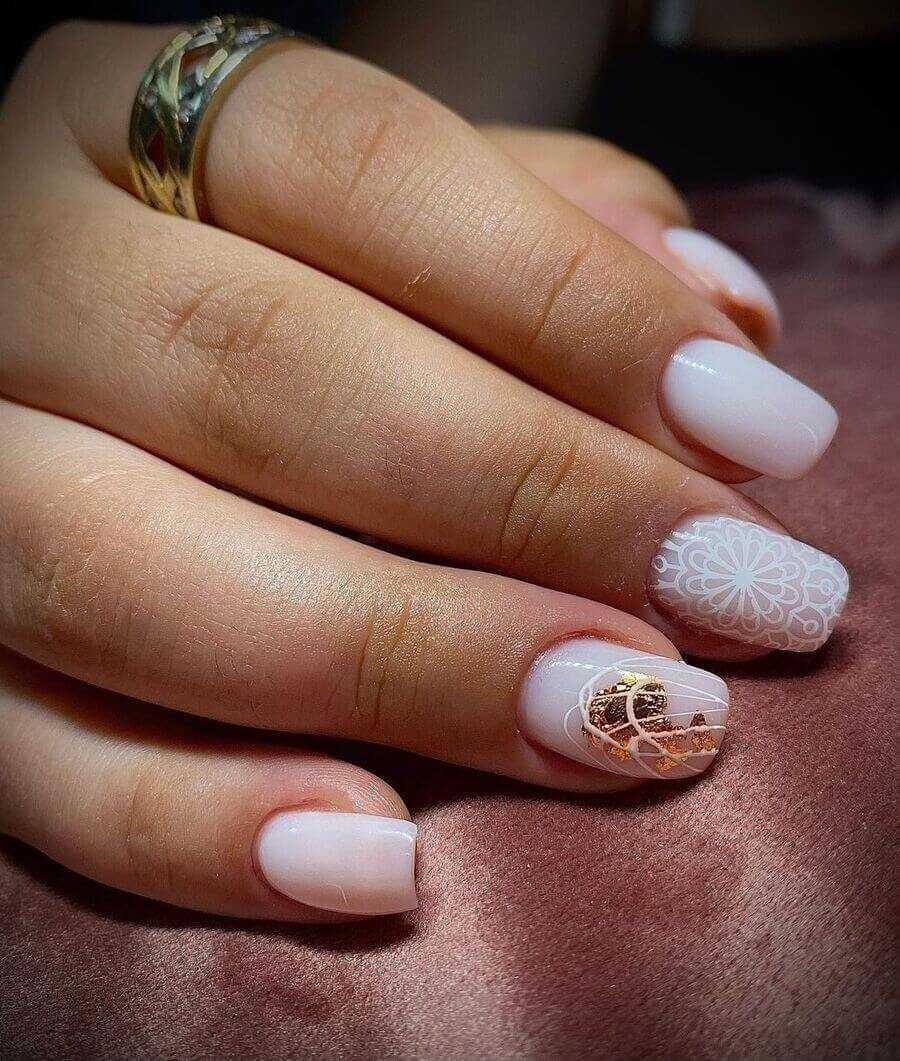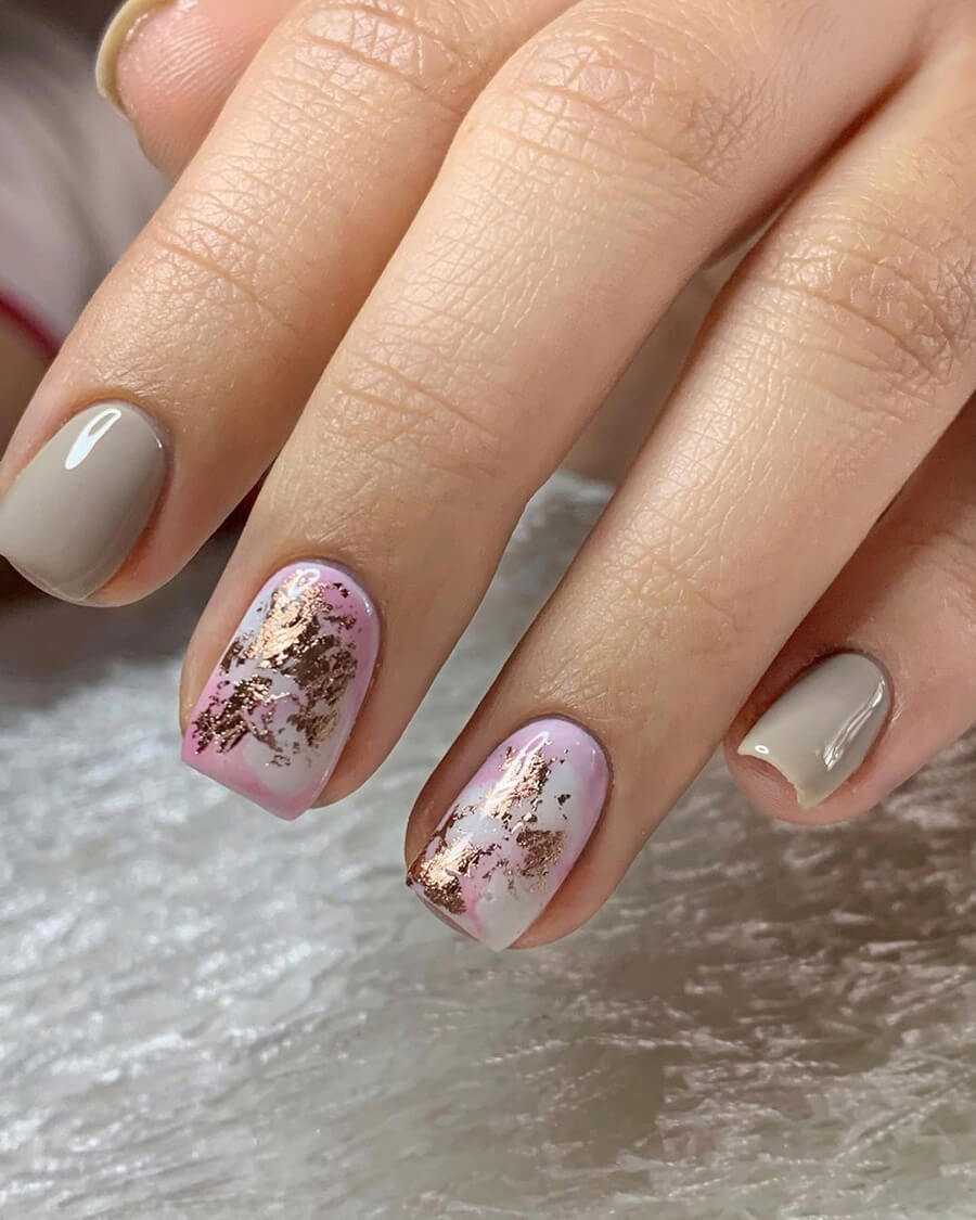 Считается, что носить бежевые ногти предпочитают скромницы или минималистки. Такой цвет маникюра сливается с кожей и совсем не бросается в глаза. Но опытный мастер, с широким полетом творческой фантазии, может необычно обыграть свойство бежевого лака сливаться с цветом кожи. Помочь ему может в этом такой материал, как фольга. Если использовать большое количество фольги, то ногти будут просто светиться металлическим сиянием, завоевывая взгляды красотой орнаментов. Или, напротив, нанести фольгу сдержанно, на матовый фон — для эффекта таинственного сверкания. В любом случае в восторге будут все: и минималистки, и любительницы ярких вариантов.