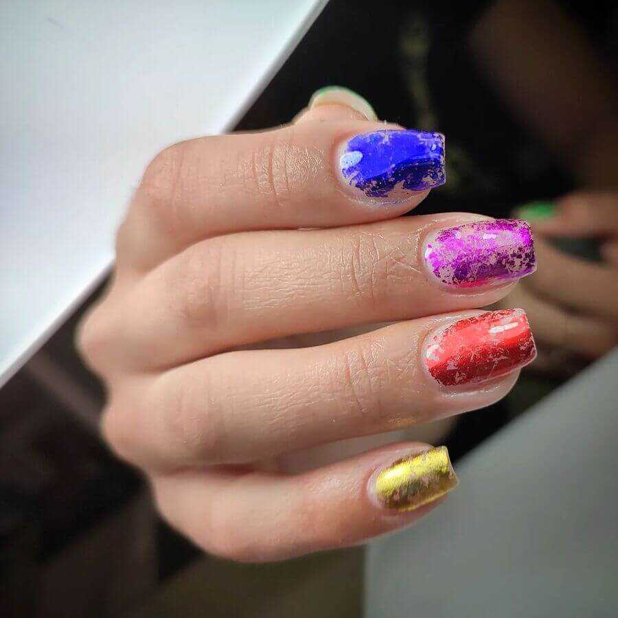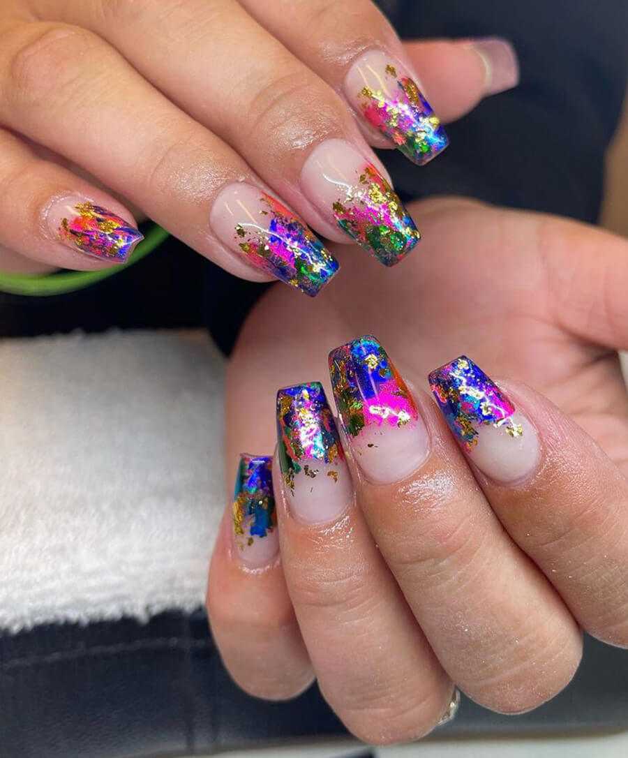 Они подходят как для малой части ногтевой пластины, так и для всей ее поверхности. Дизайн ногтей выходит насыщенным и роскошным, напоминает радугу, которая переливается множеством цветов.