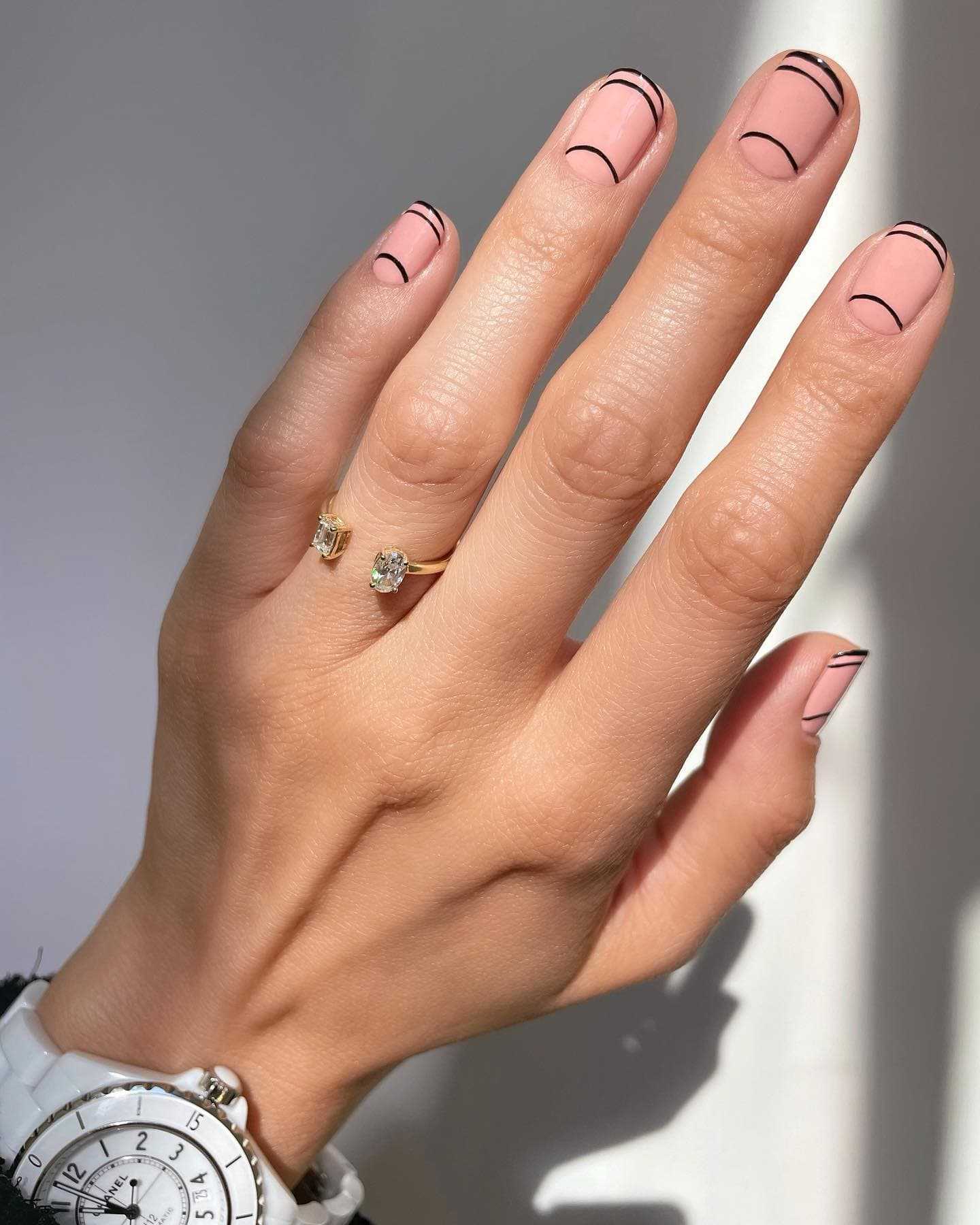 Более сдержанным и лаконичным выглядит нейл-дизайн с тонкими золотыми полосками на чёрном фоне.