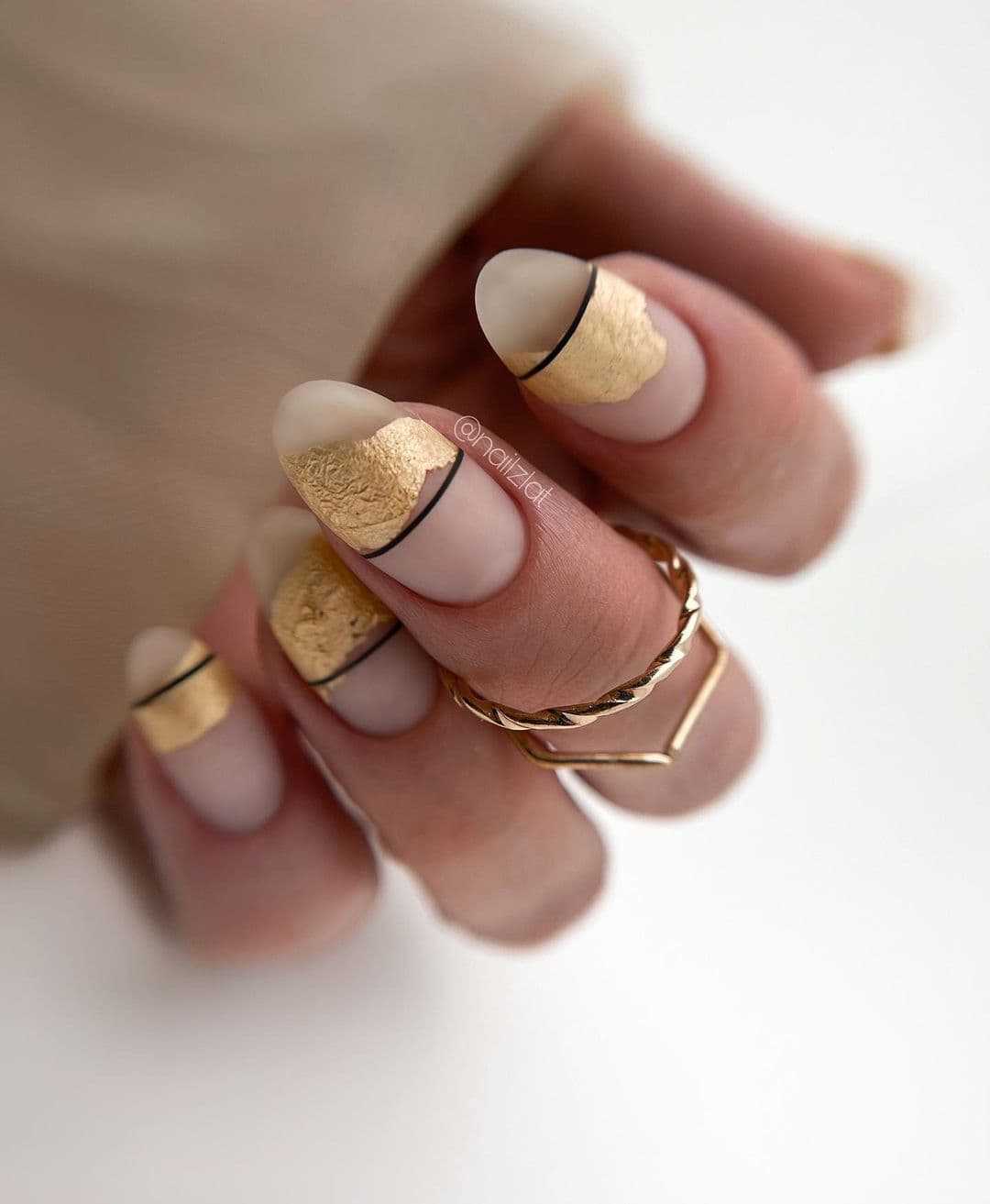 Следующий маникюр построен на контрастах. На черной основе блестящая полоска выглядит выразительно и притягательно. Именно черно-золотой френч — это один из самых популярных среди женщин. Дизайн с черным кончиком на золотистом фоне просто обожают стильные молодые оптимистки.