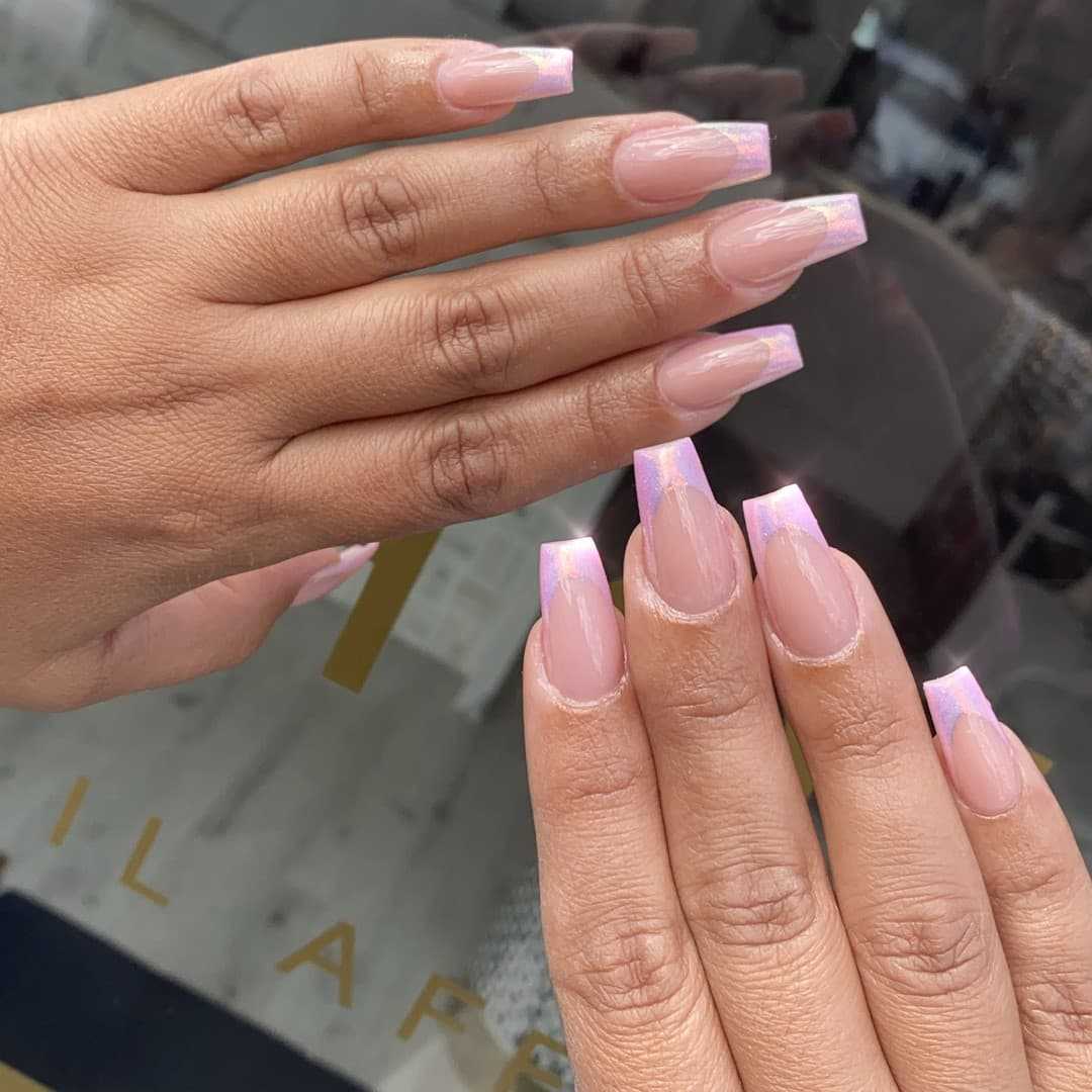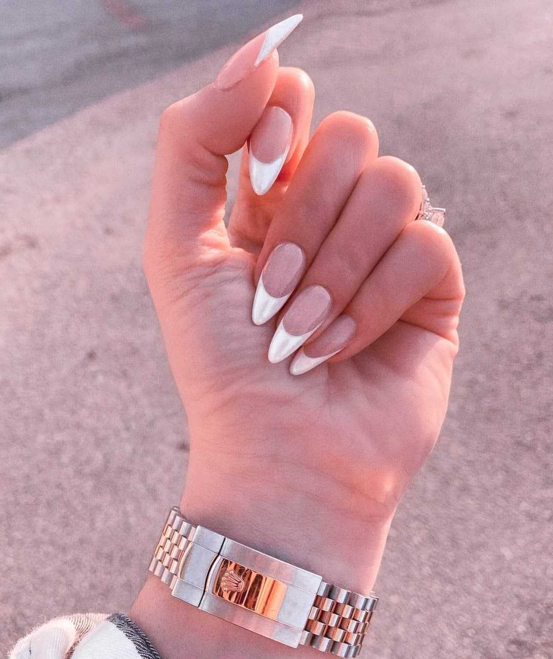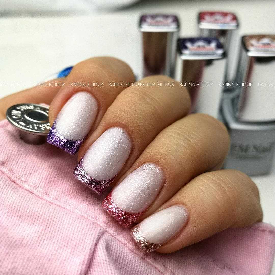 Совсем иной характер имеет дизайн с белой основой и блестящим кончиком. В нем воплощена ангельская чистота и возвышенность. Если вы хотите подчеркнуть интеллигентность и романтизм легких светлых летних нарядов, то такой вариант — идеальный для этого.