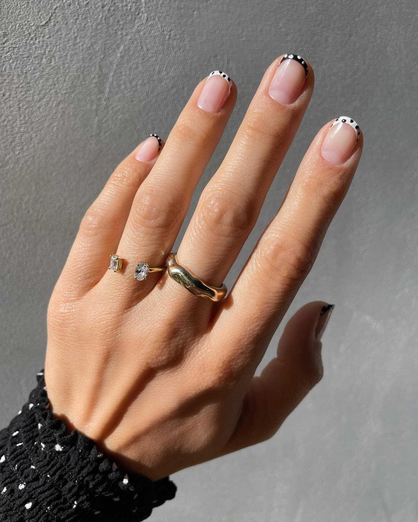 Оживить чёрный маникюр позволяют мелкие, лаконичные стразы, бульонки, капли золотого лака, рисунки дотсом.