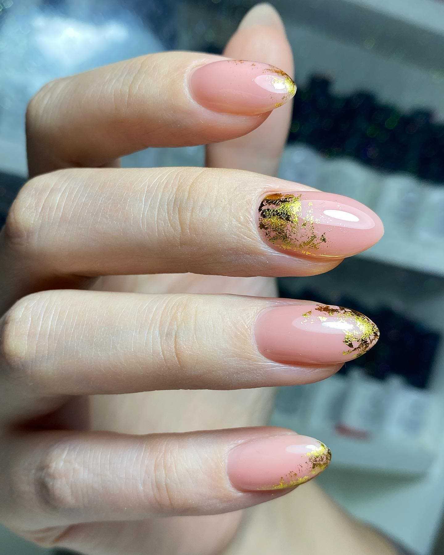 Для любителей яркого, сияющего маникюра подойдёт лак с золотистыми блёстками или покрытие с мелким шиммером. Хорошего результата можно добиться с помощью золотой фольги.