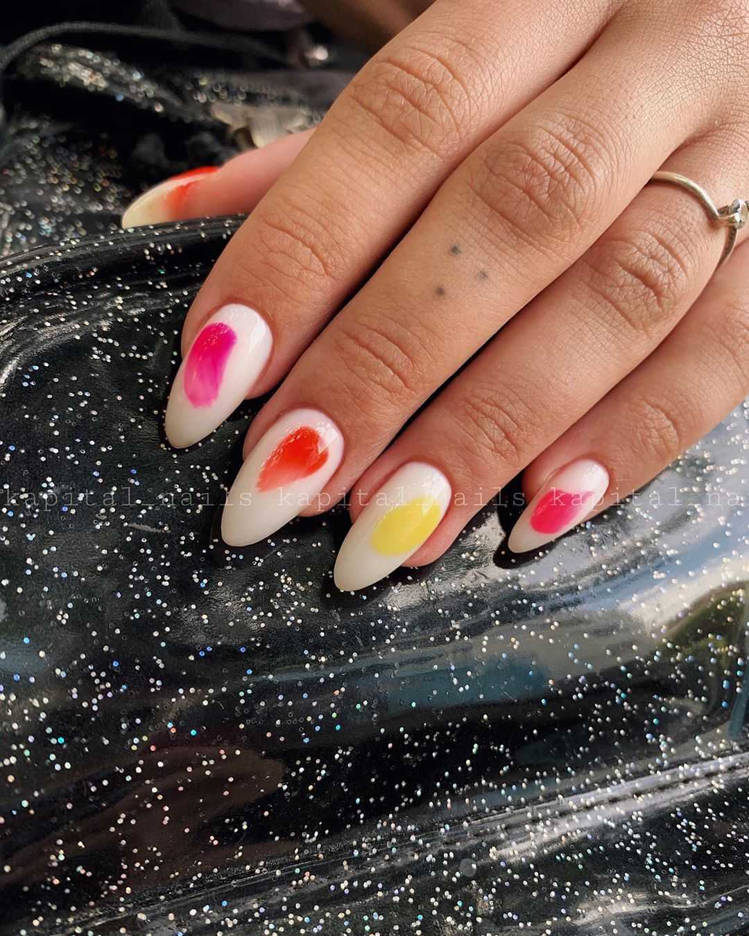 Весной − летом можно немного поэкспериментировать и сделать основу светлой, а «улыбки» − цветными. Используйте на каждом пальце новый цвет, и тогда ногти будут дарить мощный заряд положительной энергии не только вам, но и окружающим.