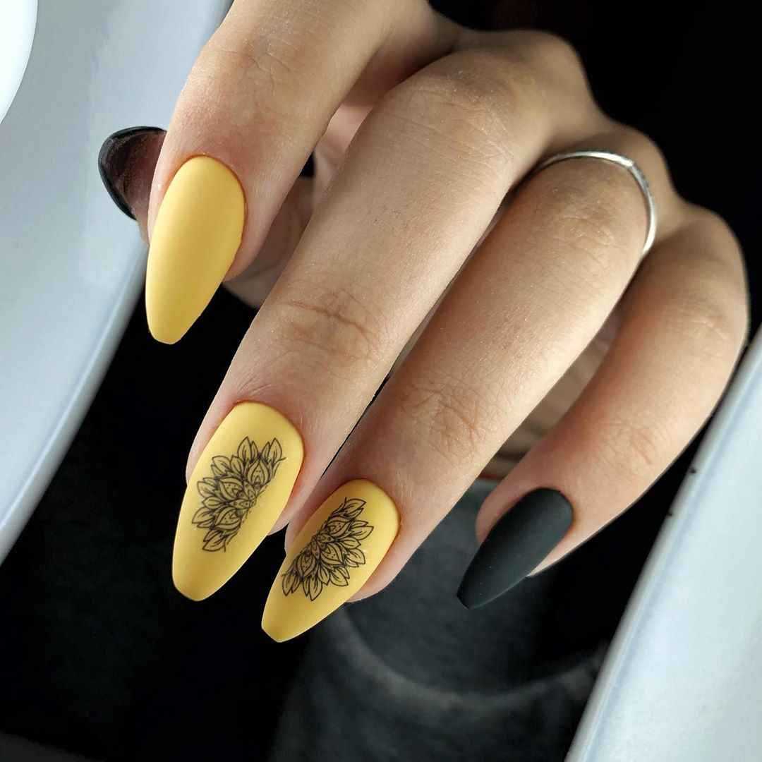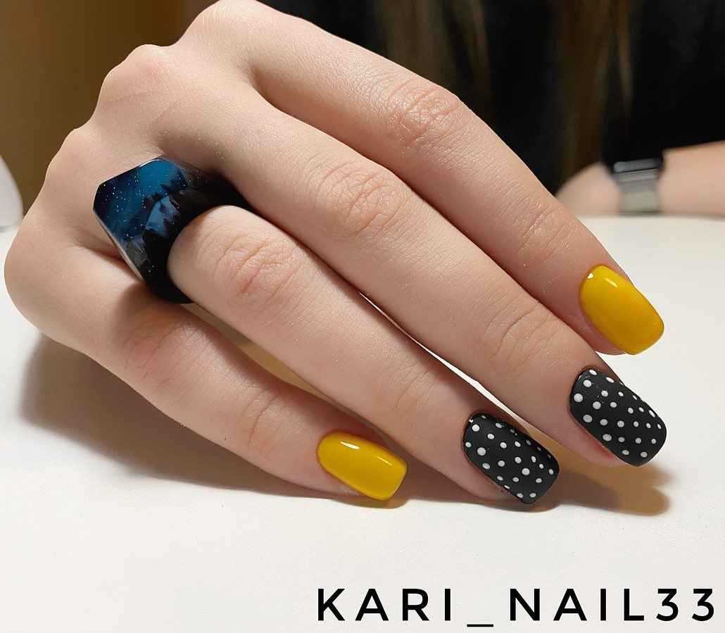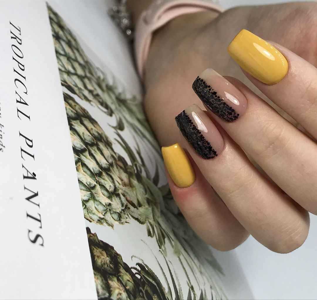 Горчичный маникюр с черным лаком