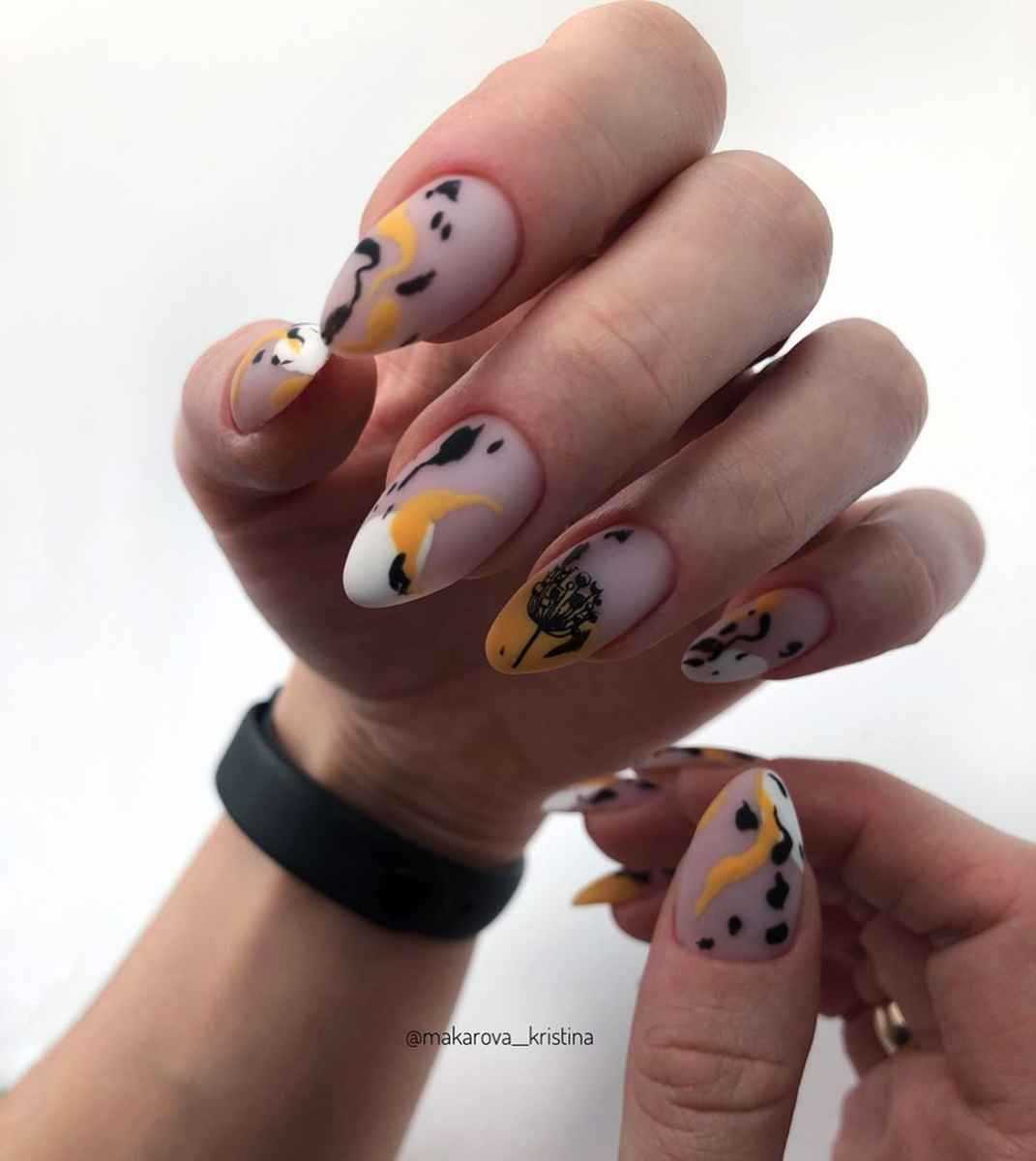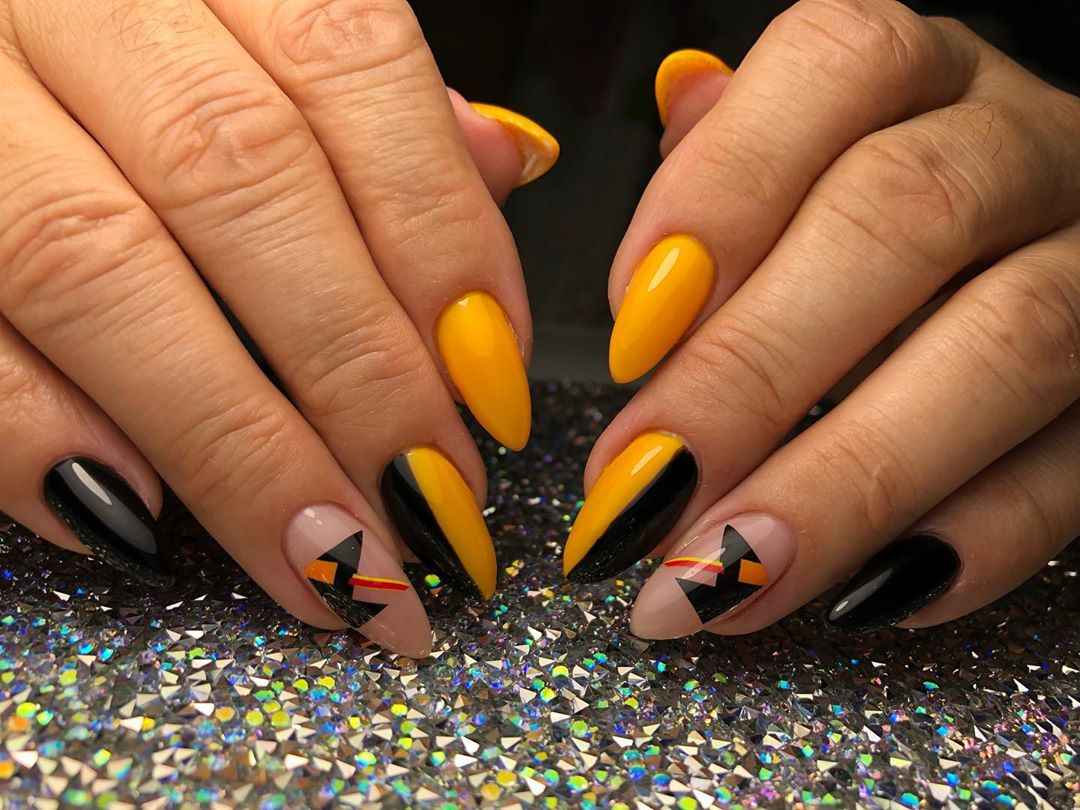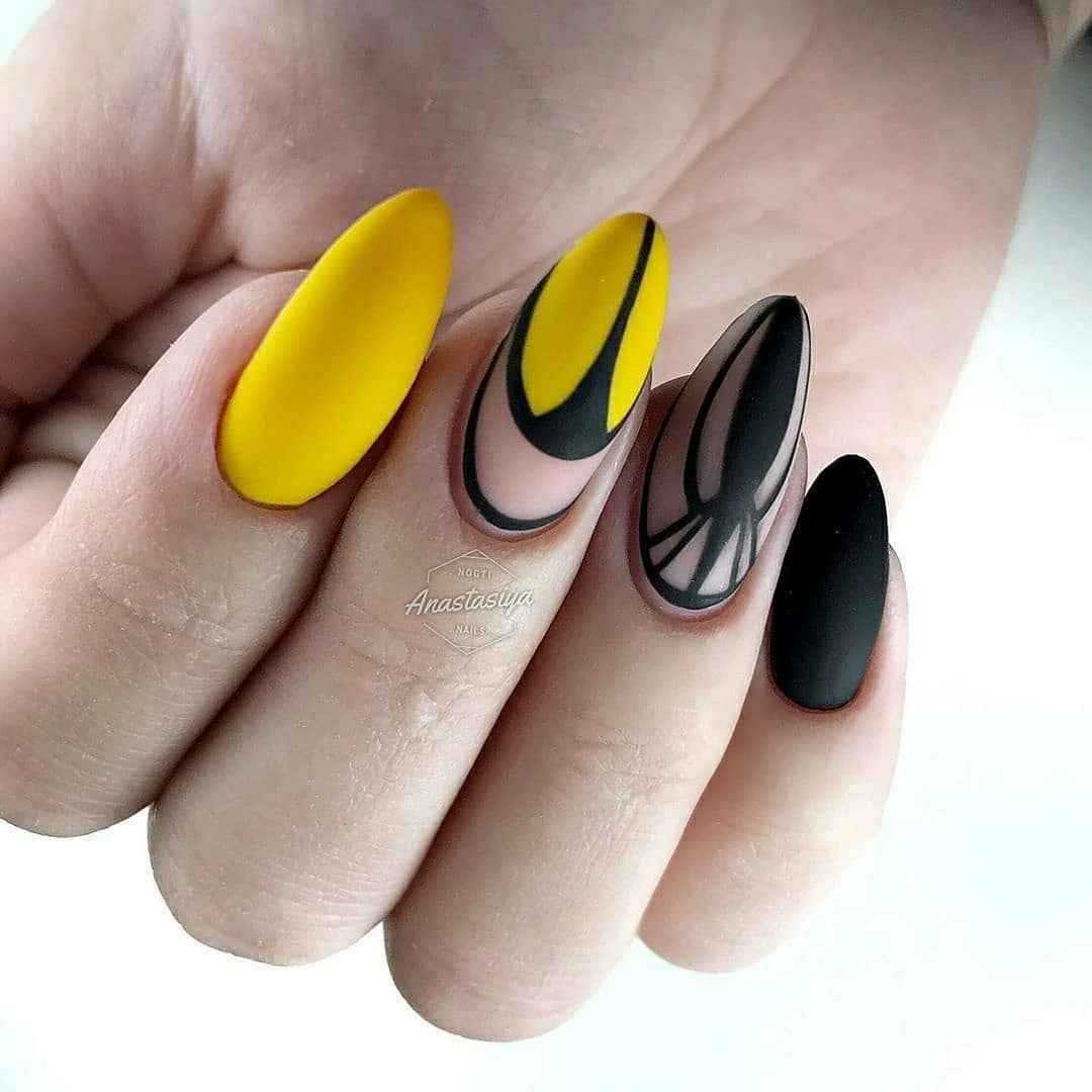 Горчичный маникюр с черным лаком