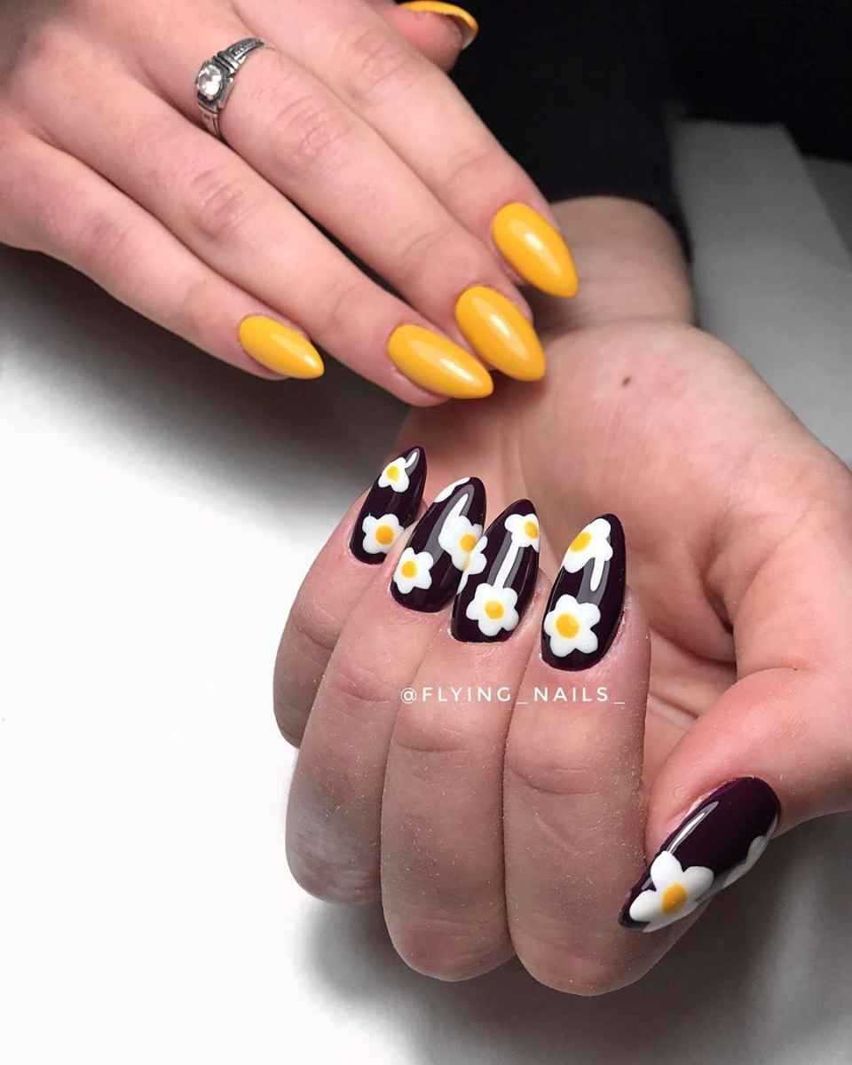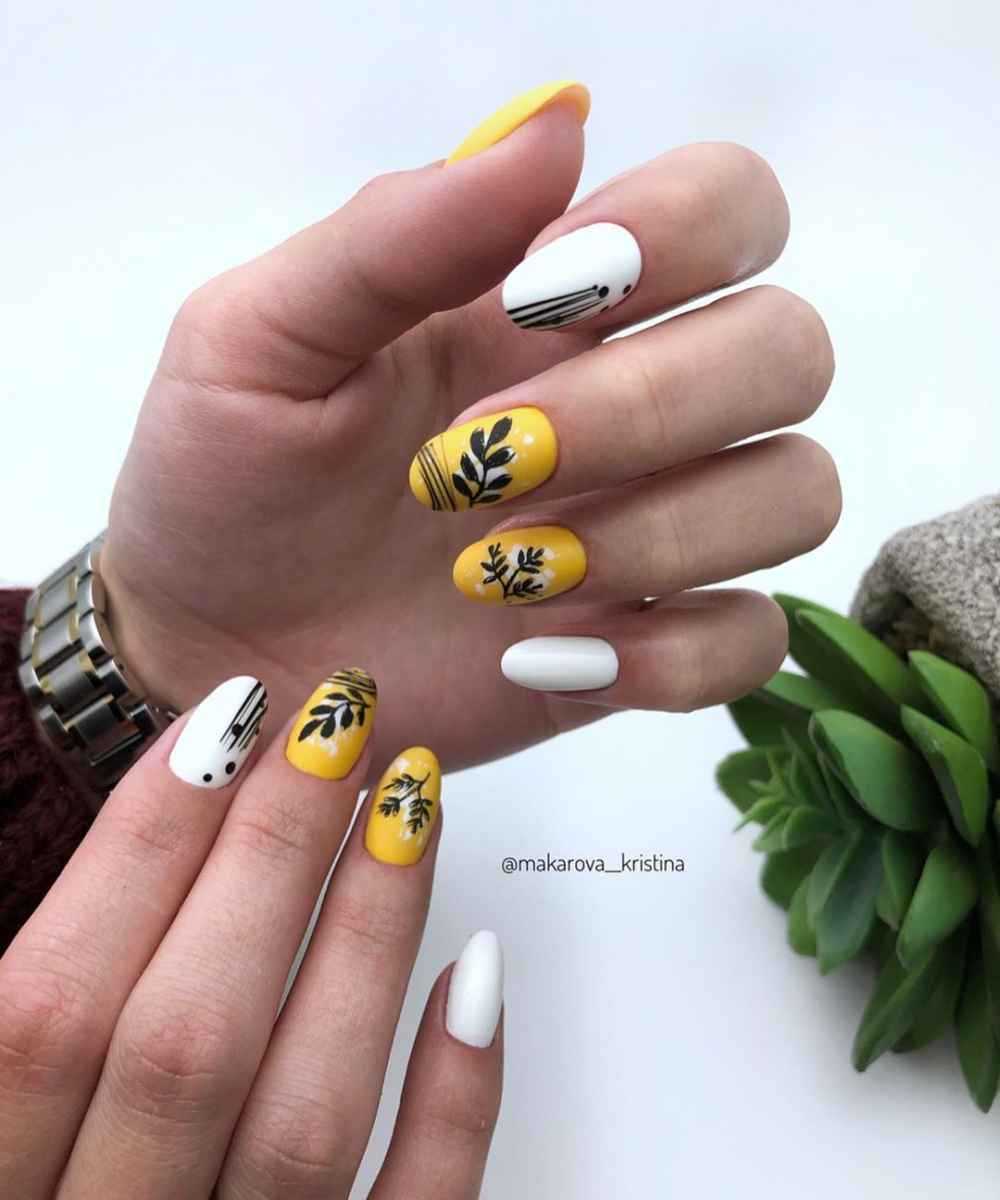 Если вы побаиваетесь желтого и считаете его чересчур привлекающим внимание, попробуйте сочетать его с бежевым или вовсе прозрачным лаком. На основе «нюд» рисунок, изображающий веточку мимозы или симпатичную ромашку, — то, что надо для летних денечков!