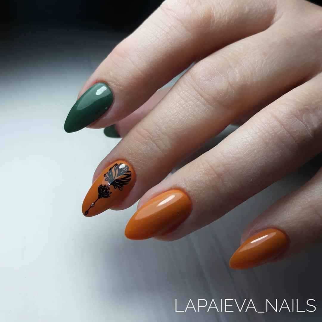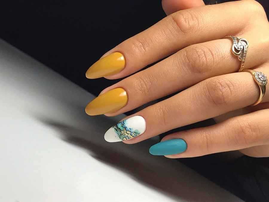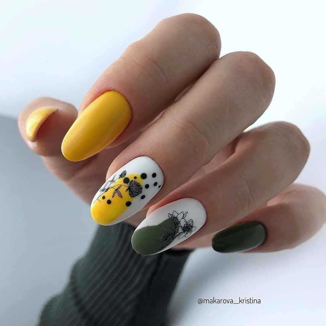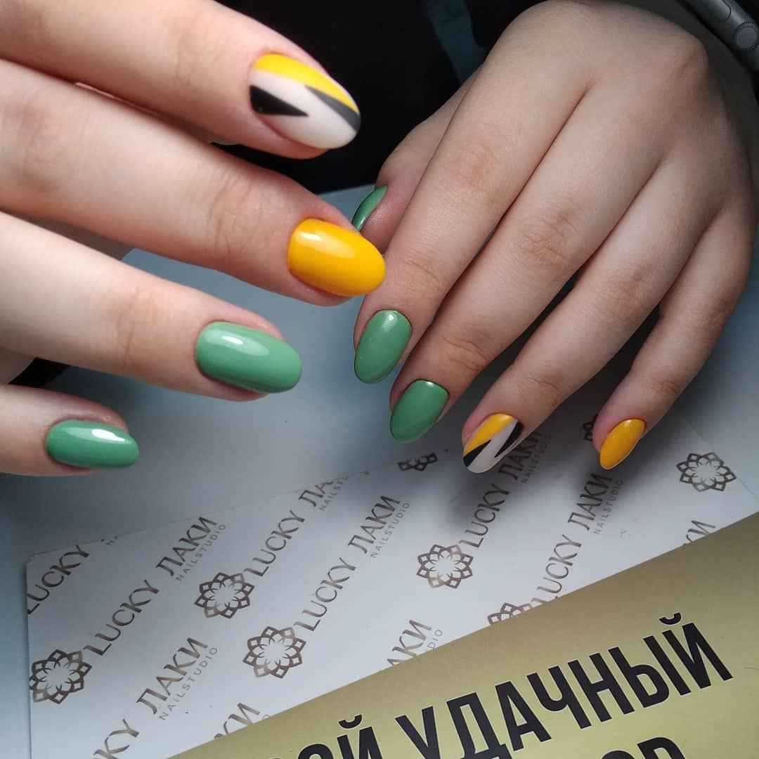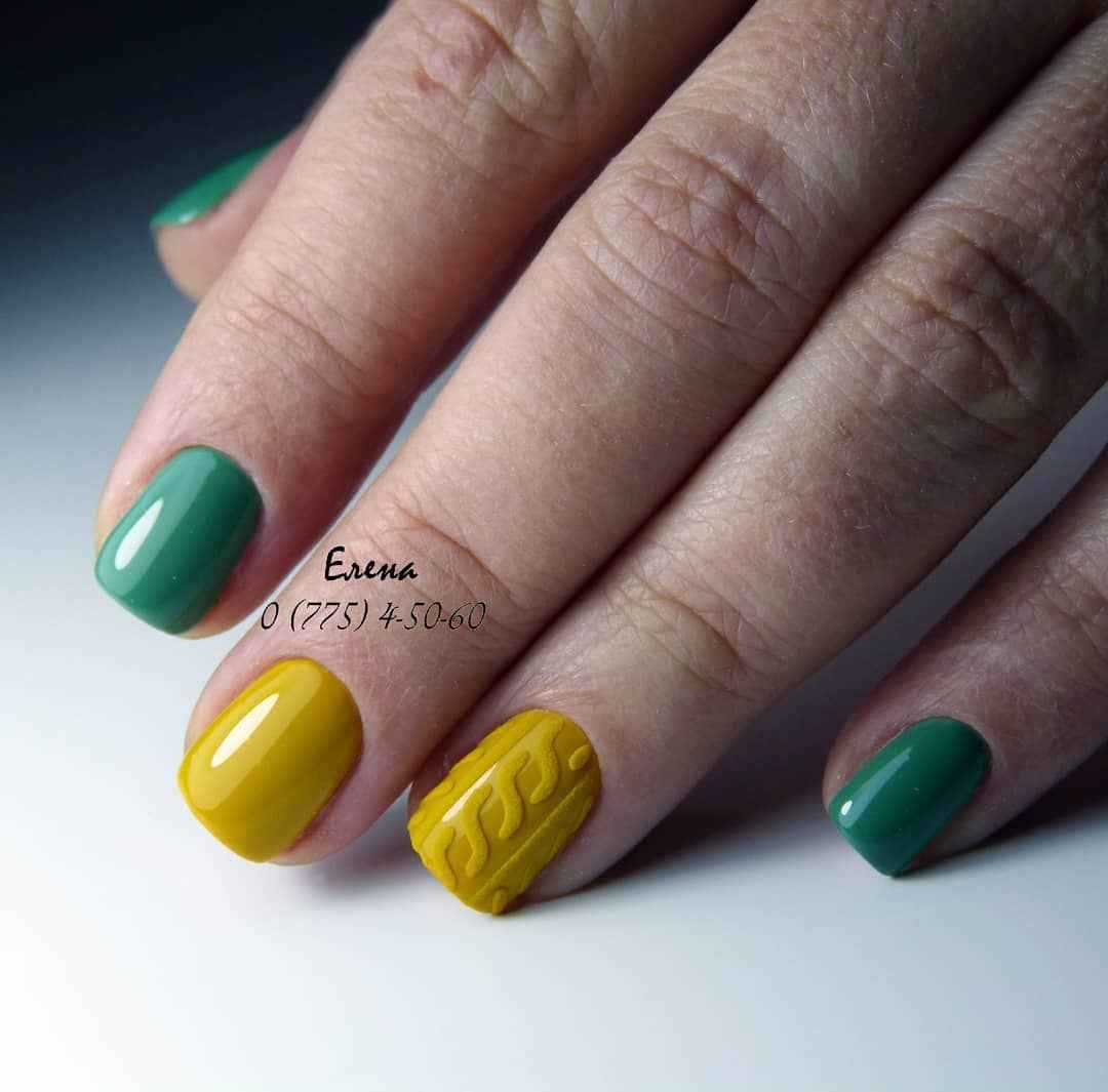 Еще один вариант, который поможет вам получить красивый маникюр – это сочетание горчичного и зеленого лака. Причем их вы можете комбинировать, как в рисунке, так и в самом маникюре, оформляя каждый палец в отдельный цвет.