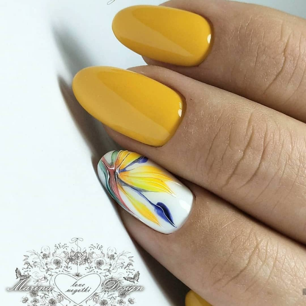При одном только взгляде на картинки, иллюстрирующие предложения нейл-арт-мастеров, интересные идеи летнего маникюра рождаются сами собой. Не решаетесь пока на что-то оригинальное? Начните с малого: покрасьте все ноготки в выбранный оттенок желтого. Можно немного усложнить задачу: скажем, сделать все ногти бледно-лимонными, а один – насыщенного горчичного цвета.