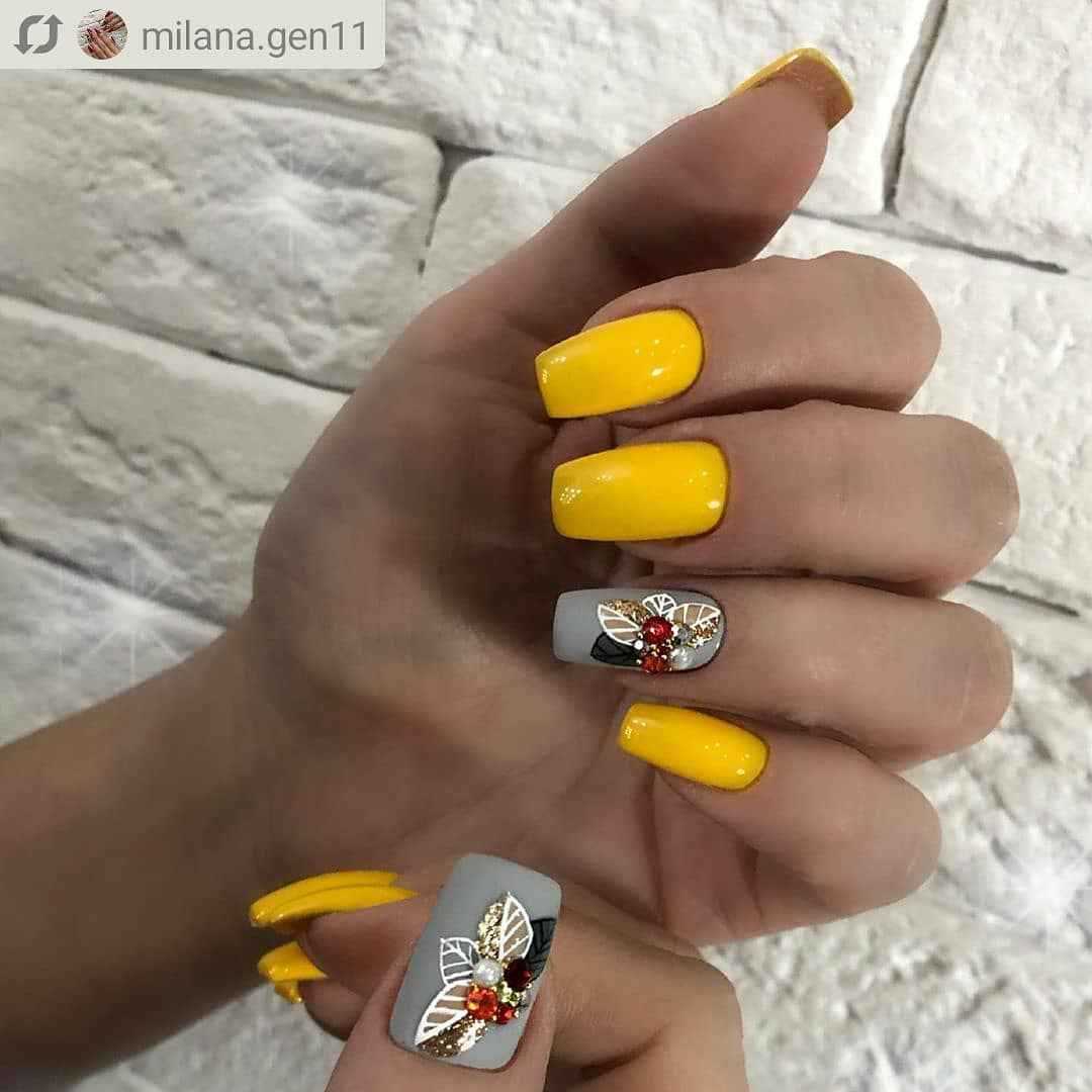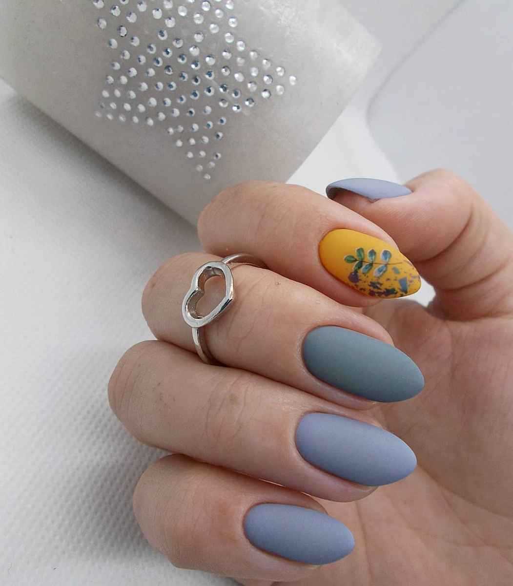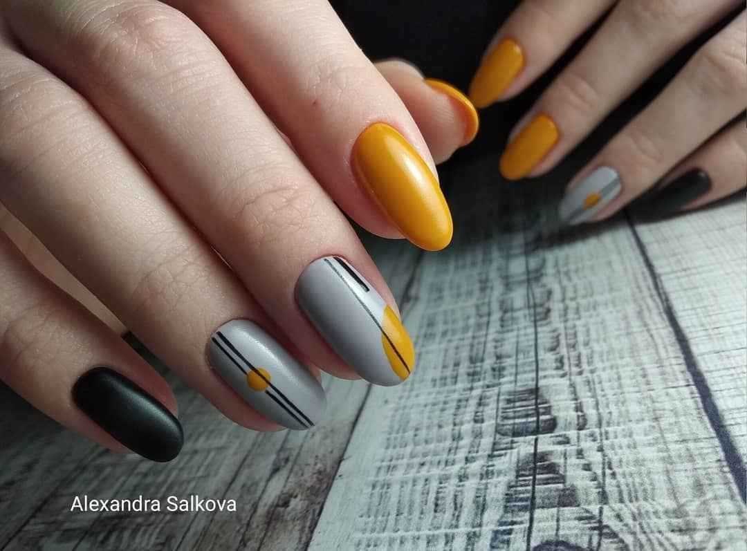 С серым. Еще один нейл-дуэт, который достоин внимания. Он идеально дополнит осенние и зимние аутфиты. Благодаря горчичному серый смотрится на ноготках более интересно. Такой маникюр будет уместен в повседневных и деловых образах. А вот на вечер лучше выбрать что-то более яркое.