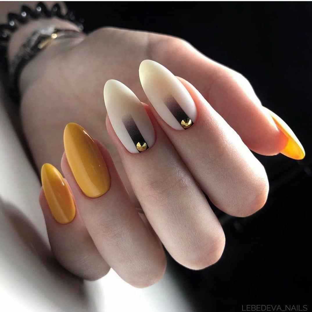 С молочным и белым. Если вы хотите видеть на своих ноготках что-то ненавязчивое, приятное, успокаивающее, тогда обратитесь к этому дуэту. Горчичный на фоне классического белого или ультрамодного молочного смотрится легко. Это очень красивое сочетание на каждый день.