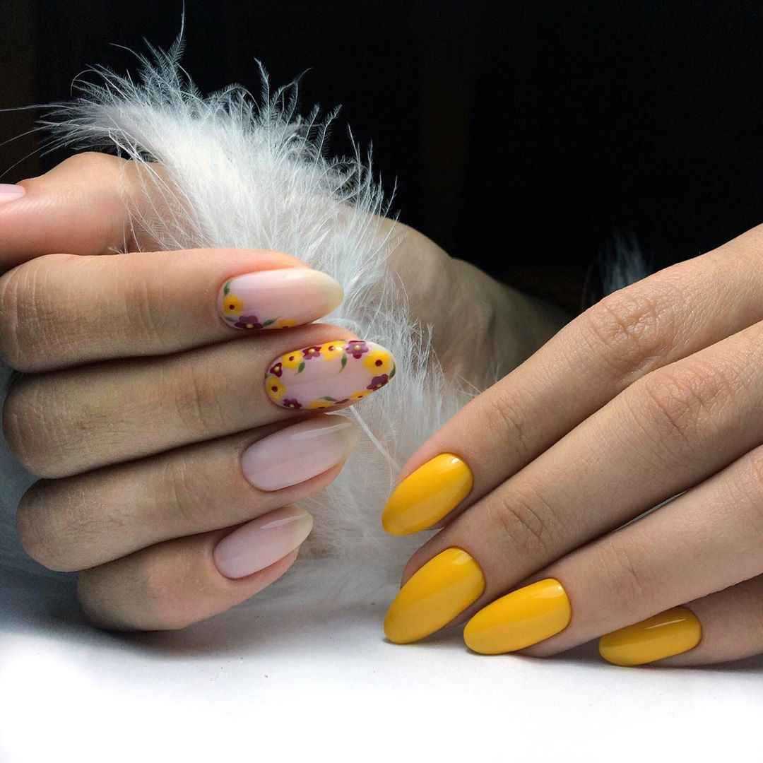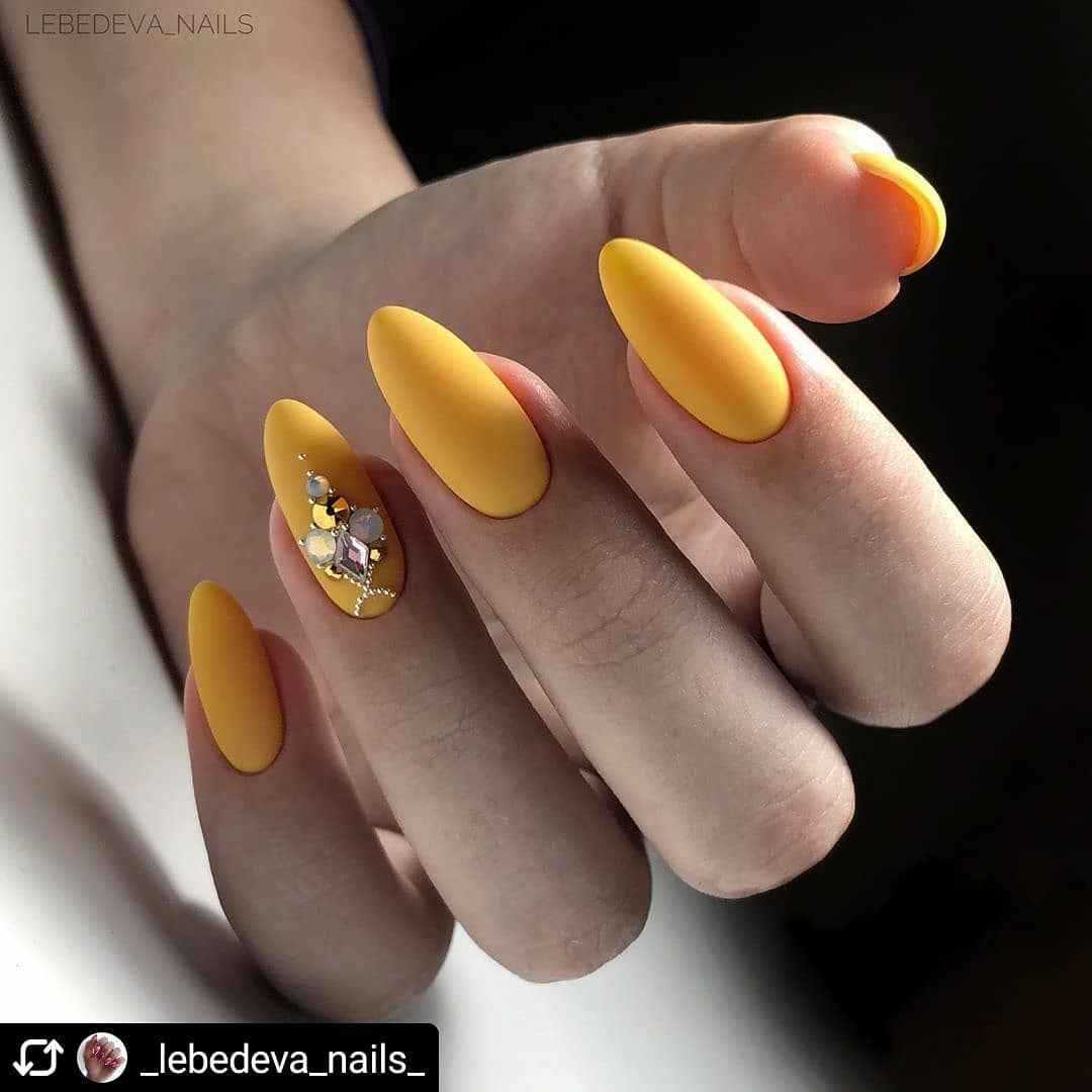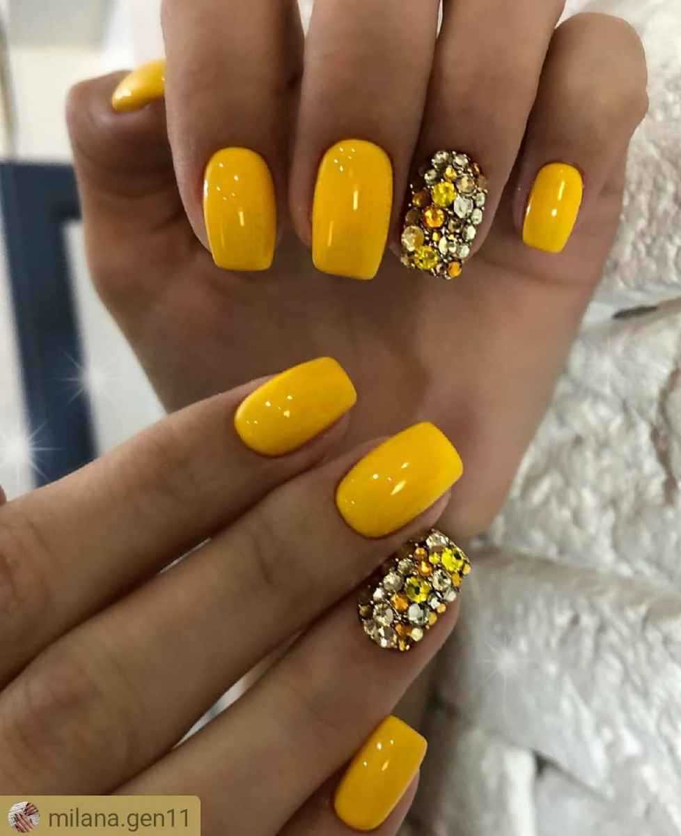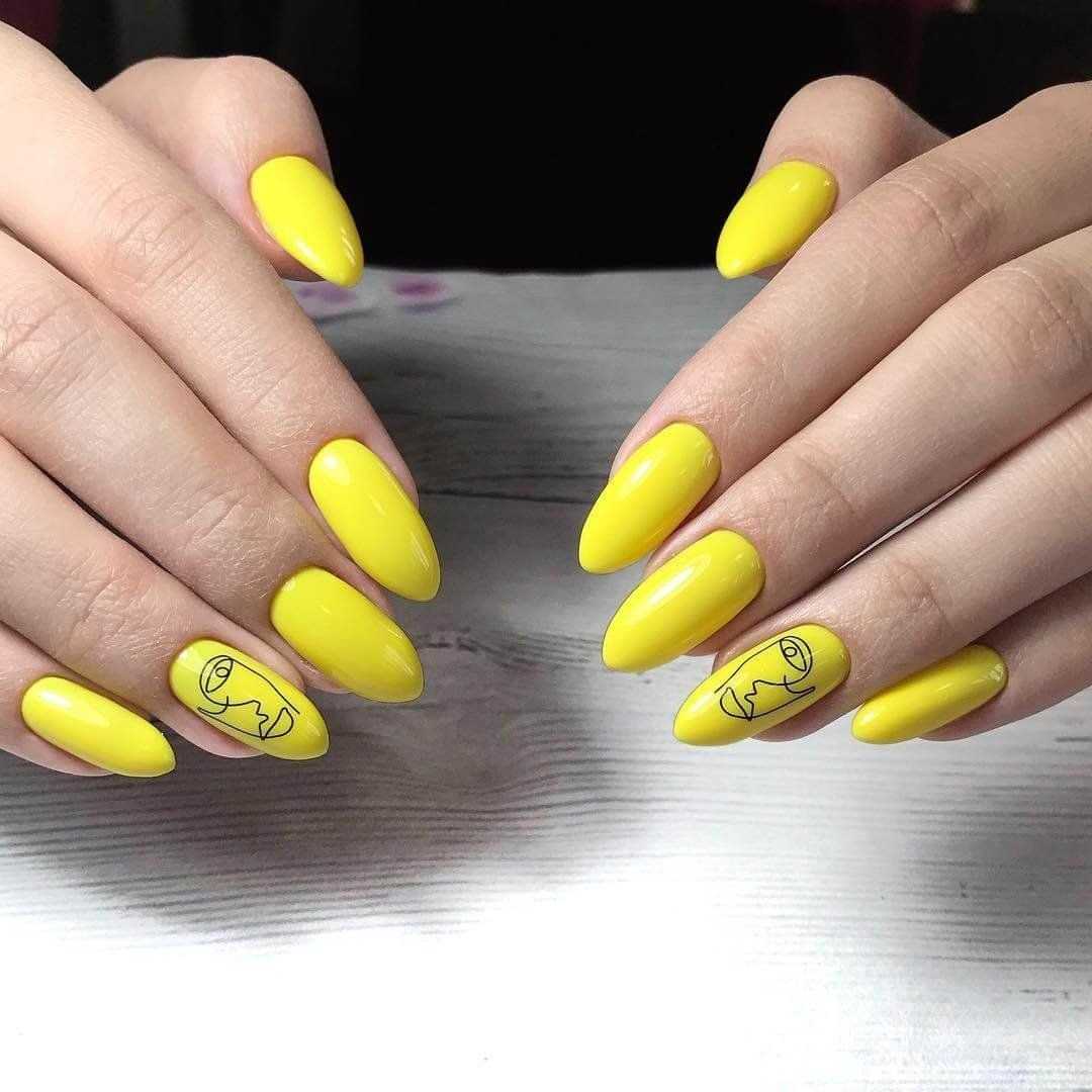 Насыщенный оттенок является самым популярным выбором в летнее время. Он идеально сочетается с короткими ноготочками любых форм. В комбинации с мягким квадратом или миндалем желтый не отвлекает внимания от образа обладательницы.