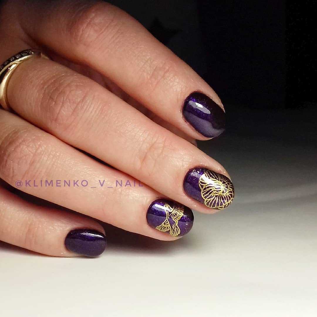 Красивый маникюр, где на дорогом, бархатном фиолетовом фоне нарисованы золотые вензеля — удел самодостаточных, уверенных в себе женщин, никогда не изменяющих классике.